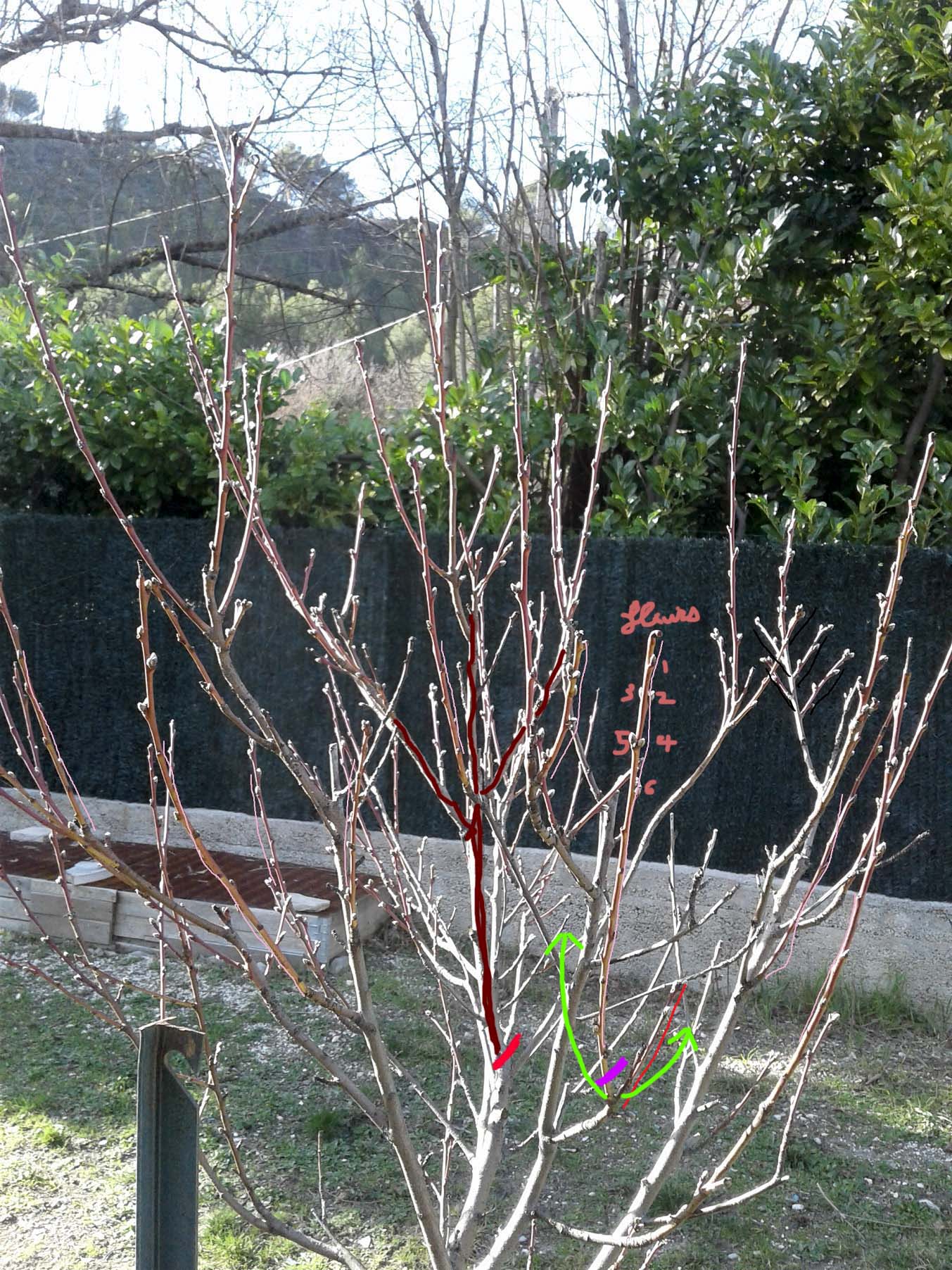 alors je m'explique je commence par vous donner mon impression alors si j'ai bien compris tout ce qui est en rouge va donner des fruits car nouvelle pouce ? en noir je pourrais couper car bois mort et petite brindille? le blanc je peux couper car elle av rentrer a l'interieur car faut couper tout ce qui va ce croiser et eviter que ca rentre a l'interieur de l'arbre . et les 2 jaunes je pourrais couper non??? et une question il faut laisser combien de bourgeon en fleur sur la branche 6 je pense que c'est bon non? VOILA si qq chose ne va pas rectifier svp merci