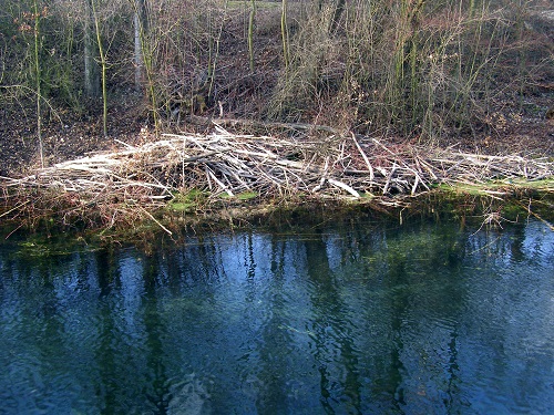 Mais parfois la hutte est discrète, voire inexistante. Celle-ci par exemple ne peut se voir qu'en barque, sur le fleuve Rhône, dans un coin très sauvage. On y voit un petit tas de branches sous un négundo. Mais c'est bien un terrier-hutte.