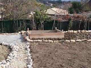 Je me suis fait un petit carré pour faire quelques semis , tomates, courges etc.... Pour l'instant j'ai fait beaucoup de boulot sur le devant de ma maison , 2 murets de soutènement en pierre sèche. Avec beaucoup de Cactus , un Olivier, un mandarinier et un citronnier. Au pieds de ma maison , je me suis fait plaisir avec un terrain de boule et 3 autres arbres, un figuier, un cerisier et un Nectarinier.