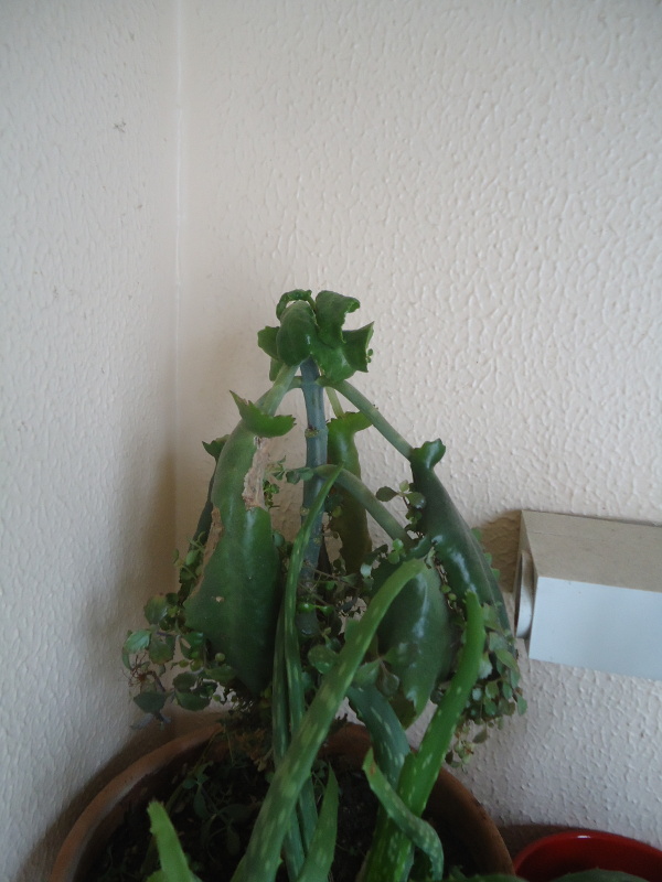 Le premier est encore celui qui se porte le mieux, même si ses branches tombent lourdement. Le deuxième (plante d'origine) a refait des feuilles au sommet après s'être littéralement cassé en deux sous son propre poids il y a six mois. Les nouvelles feuilles se recroquevillent, elles n'ont pas l'air bien en forme. Le troisième (bouture du sommet cassé du précédent ^^) noircit et pourrit au sommet, les autres feuilles se recroquevillent. Les trois plantes sont près d'une fenêtre orientée est (soleil le matin, donc), je les arrose peu (un demi-verre toutes les deux ou trois semaines). Il fait assez froid chez moi, environ 15°C l'hiver. Le substrat n'est pas particulièrement riche, généralement de la terre de jardin récupérée à droite à gauche, parfois mélangée à un peu de terreau datant d'au moins un an. Pas d'apport particulier.