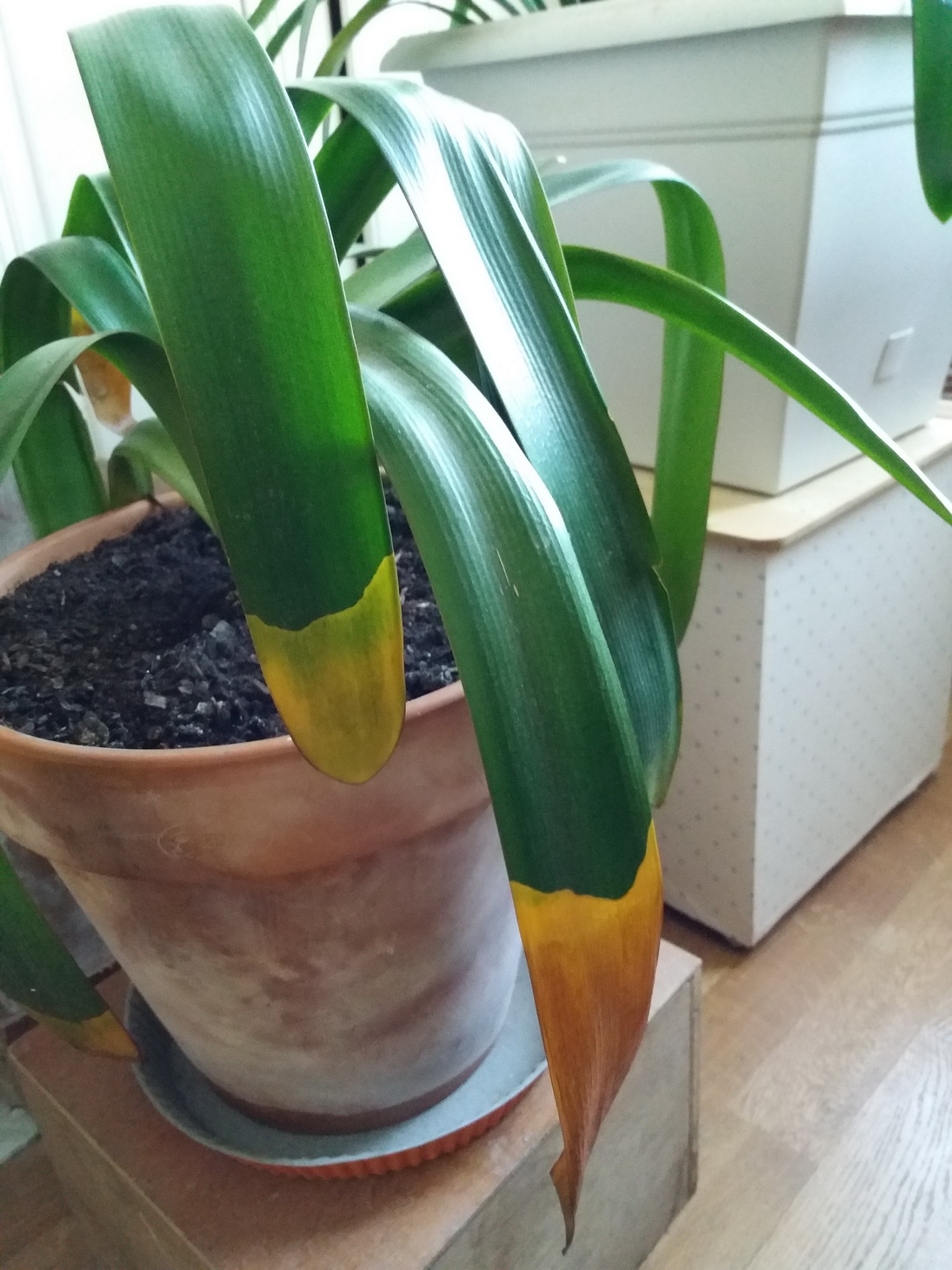 voici la photo d'un clivia dont l'extrémité des feuilles jaunit, il s'agit d'une bouture qui s'était développée sur le côté de la plante d'origine qui elle se porte très bien et même est en fleurs actuellement, cette bouture a été rempotée il y a quelques semaines.