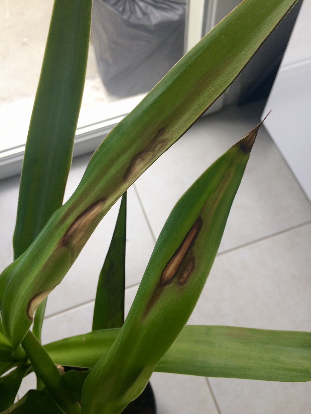 Depuis quelques jours des tâches plus ou moins importantes sont apparues sur les feuilles de mon yucca et je n'arrive pas à trouver ce que c'est.