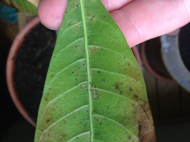 En rentrant d'une semaine de vacances, j'ai arrosé mes plantes qui en avait bien besoin et j'ai remarqué sous les feuilles d'un jeune citronnier et un manguier des tâches noirs et de petits insectes noirs (forme oblongue), cf photos.