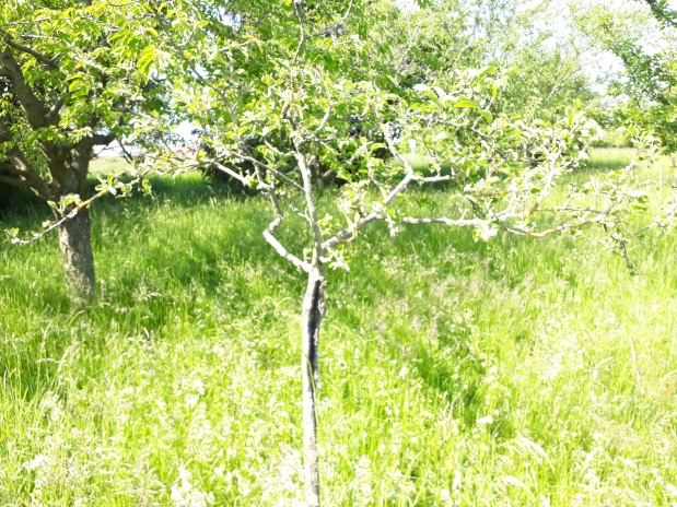 Il y a 25 ans, mes parents ont acheté un terrain de 5 ares et bien exposé en Lorraine pour en faire un verger à partir d'arbres achetés à des pépiniéristes locaux. Actuellement se trouvent à l'intérieur un cerisier, 2 pommiers, un poirier, 4 pruniers (2 mirabelliers et 2 quetschiers) et un noyer. Le sol est de type prairie et de nombreux types d'herbes et d'insectes s'y plaisent. A l'exception d'un mirabellier de 15 ans, tous ces arbres ont 25 ans, et excepté le cerisier, aucun n'a l'envergure qu'il devrait avoir (le noyer rattrape son retard, son tronc s'était brisé suite à une tempête). Plusieurs autres arbres ont été plantés et n'ont pas pris. En bordure nord ouest du terrain, un sapin et quelques arbustes prospèrent.