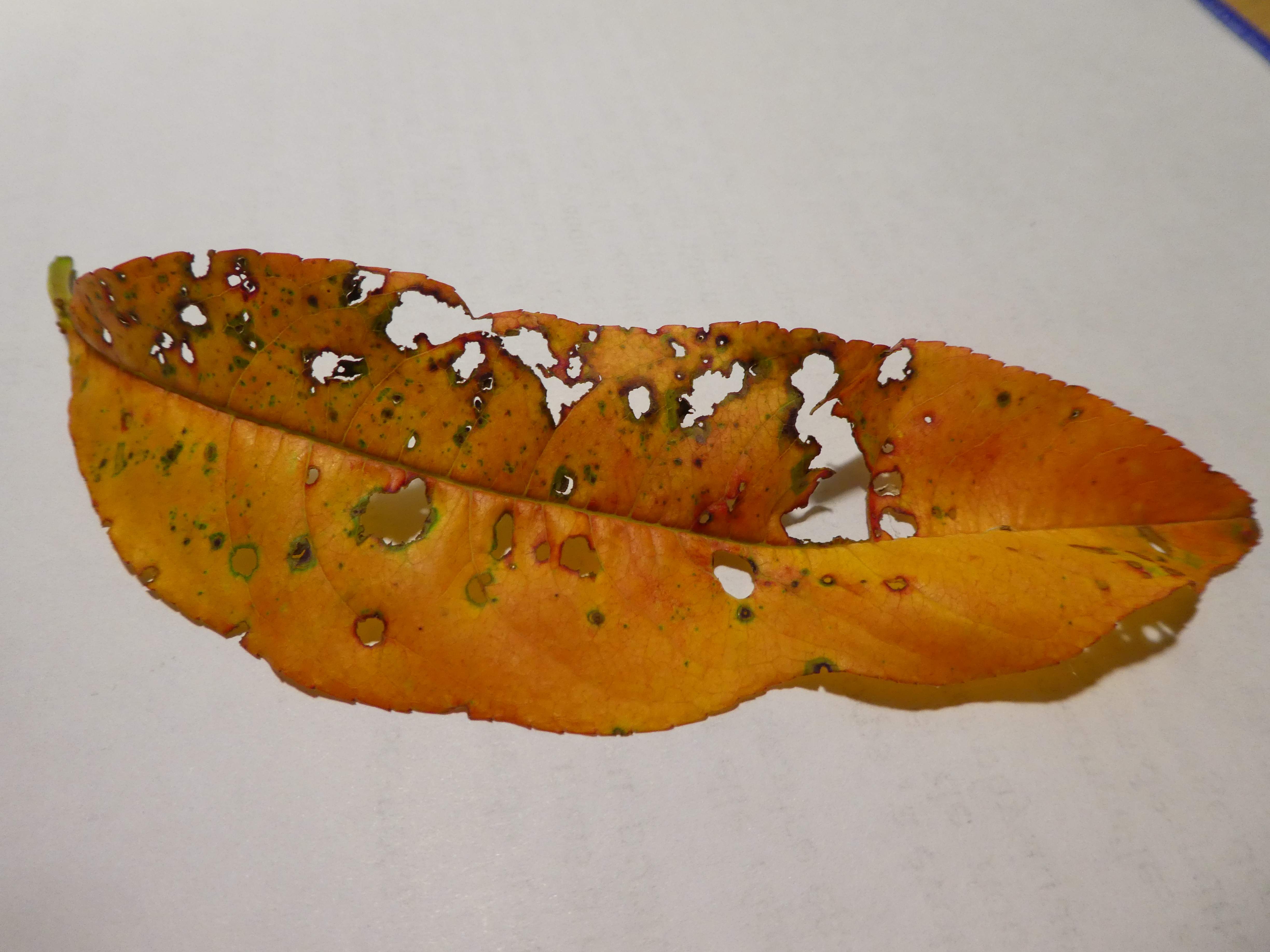 Feuilles pêchers 8 : gros plan sur une feuille qui montre qu'en plus de la coloration, la feuille est un peu "perforée". Cela se voit aussi sur la photo 1. Les perforations se produisent dans des petites taches restées vertes...