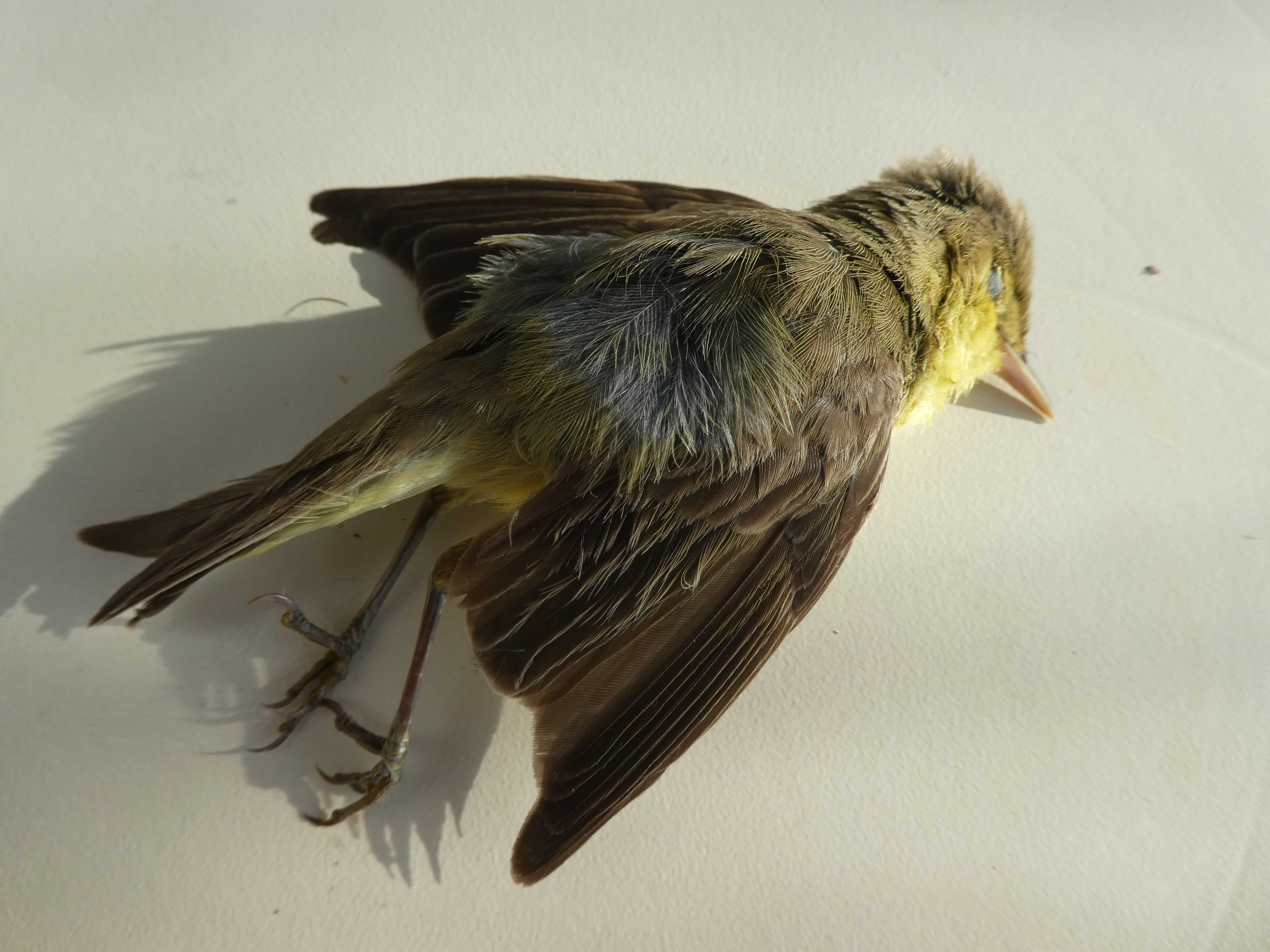 Je précise à titre posthume, car j'ai trouvé cet oiseau à la table de mon chat. Ce dernier apparemment en avait attrapé 2, et était en train de terminer le dépeçage du premier. Quand je dis "mon" chat, je ne revendique aucune propriété sur cet animal. C'est une chatte errante, que j'ai fait stériliser, et que j'ai fidélisée avec quelques croquettes. Mais elle ne rentre pas dans la maison. Elle reste un peu sauvage et continue à chasser les souris - c'est bien - et les oiseaux - c'est plus con'