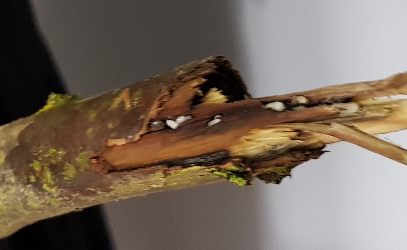 Après examen des branches, elles étaient sèches et cassantes. J'ai cassé une branche charpentière et la le choc. Dans la branche, il y avait des parties noires, comme moisie et des petits vers blans. Les vers sont très petits et ne bougent pas beaucoup.