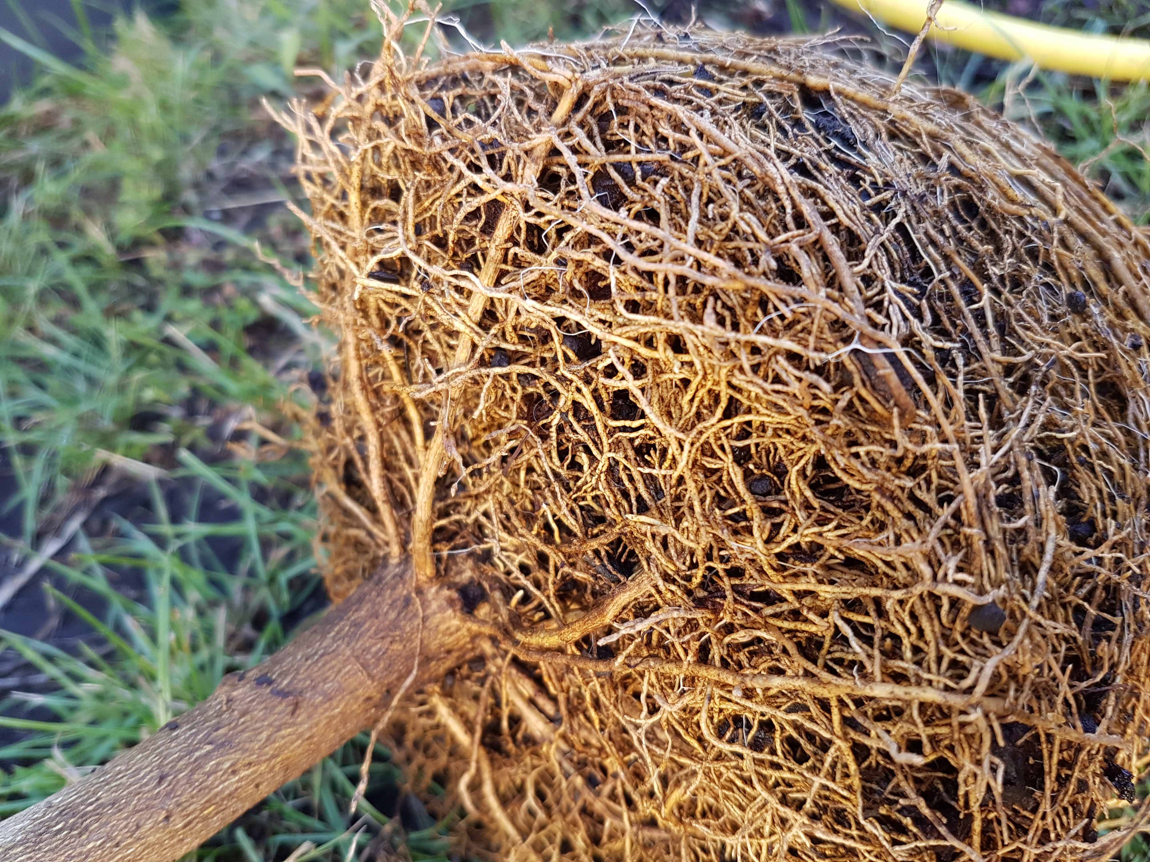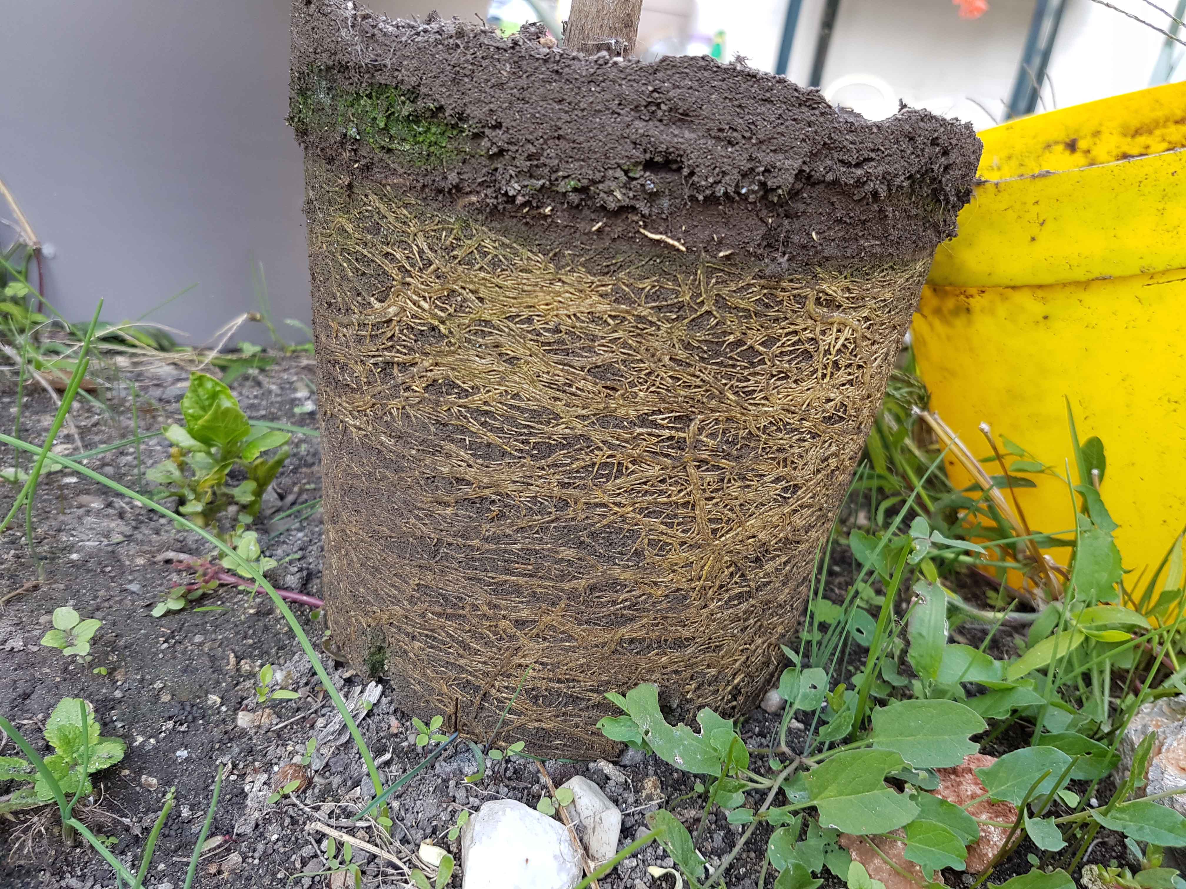 Je commence à comprendre, car quand je l'ai rempoté en septembre dernier, je n'ai pas "nettoyé les racines", simplement dégagé ce que je pouvais mais devant le côté "compact", je n'ai pas dû suffisamment dégager. Voilà comment il était :