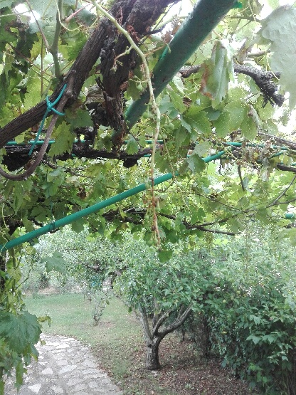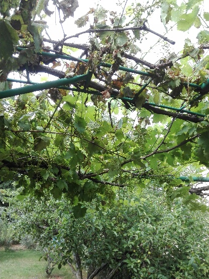 la vigne en question a été plantée par l 'ancien propriétaire et semble avoir quelques années. L'an passé nous avions trouvé de belles grappes et de belles feuilles en fin d'été lors de notre visite.