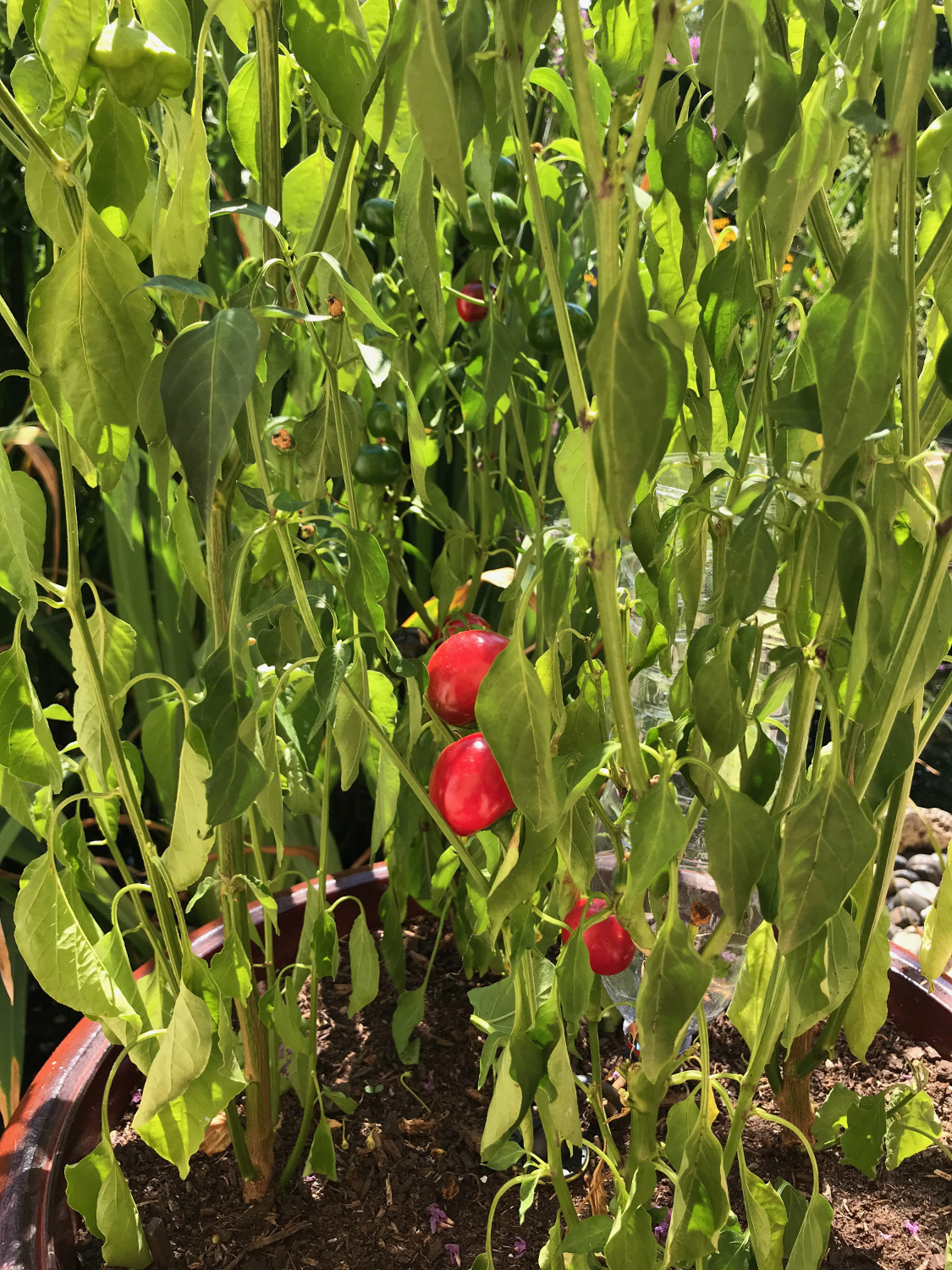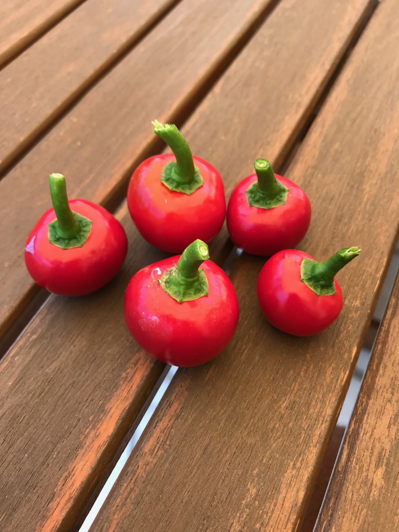 Pour la première fois, je devrais avoir une récolte de piments "Hot Cherry". Ce petit piment rond que certains servent farcis à l'apéro.