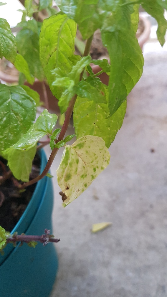 Les taches "blanches" sont dues aux piqûres de thrips et les feuilles jaunissent quand elles vieillissent.