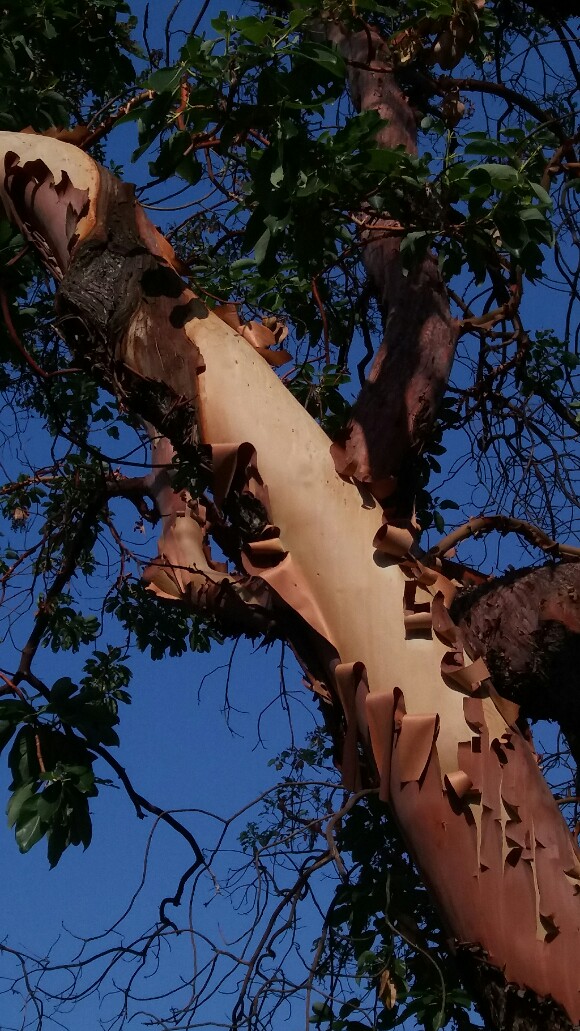 Celui-là : Arbutus menziesii est un arbre dont la fine écorce rouge orangé s'exfolie. Donné pour être présent au Canada.