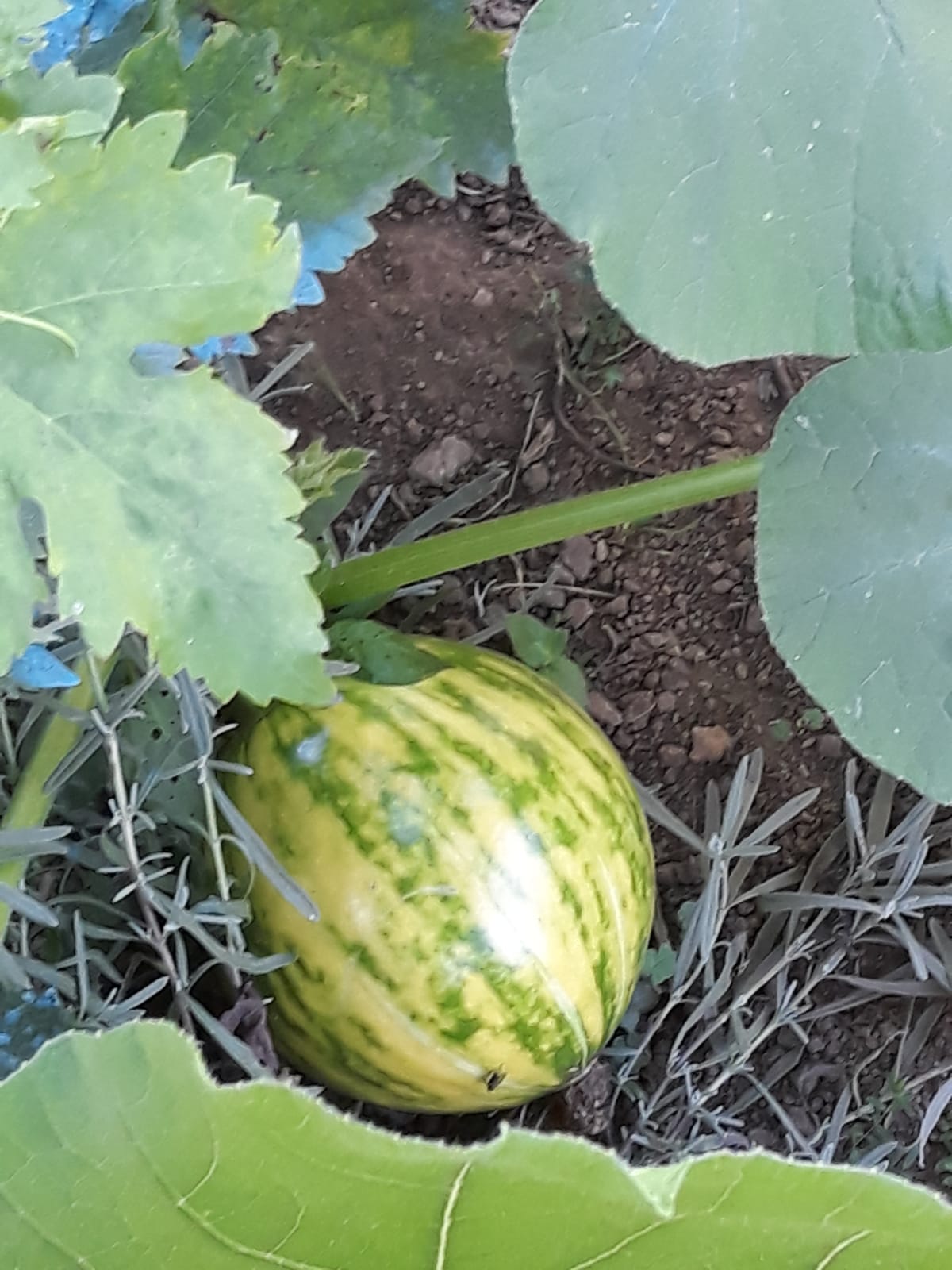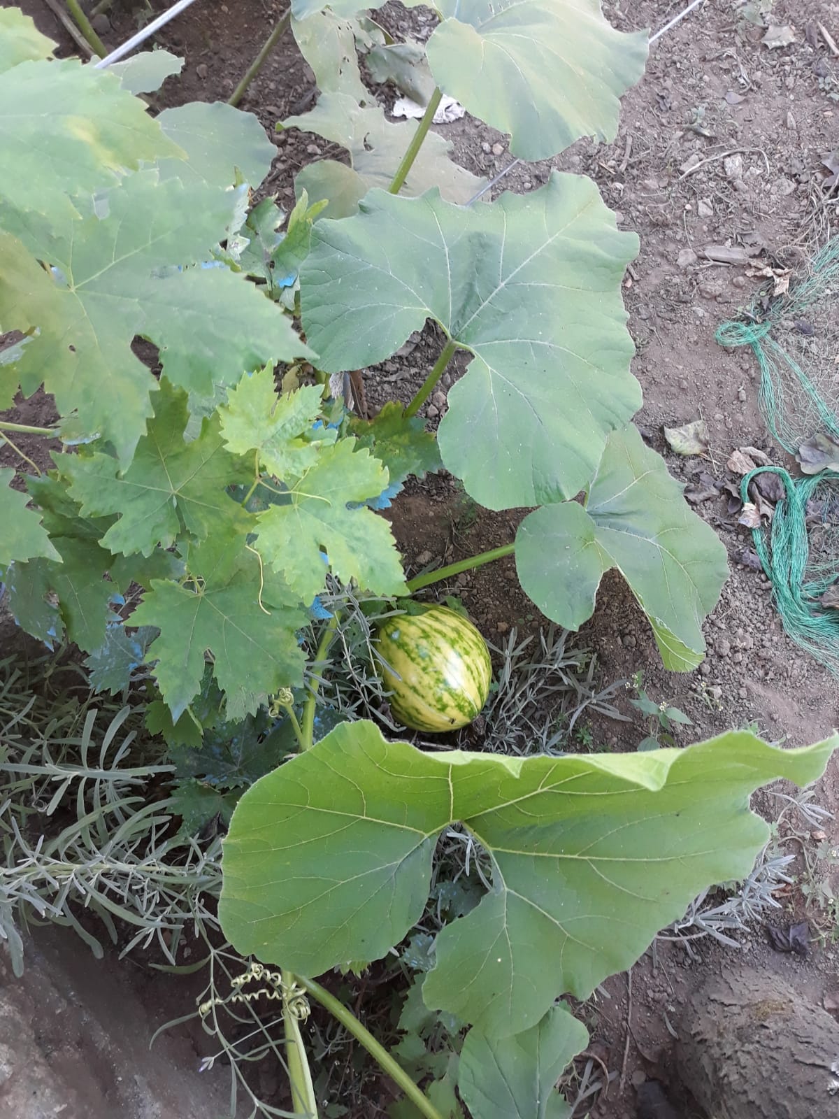 Bonjour, ma Belle soeur m'envoie ces photos, une cucurbitacée qu'elle n'a pas semée s'est invitée chez elle. La forme et les rayures rappellent effectivement une pastèque, mais là feuille ressemble plutôt a une courge... quelqu'un pour nous éclairer? Merci