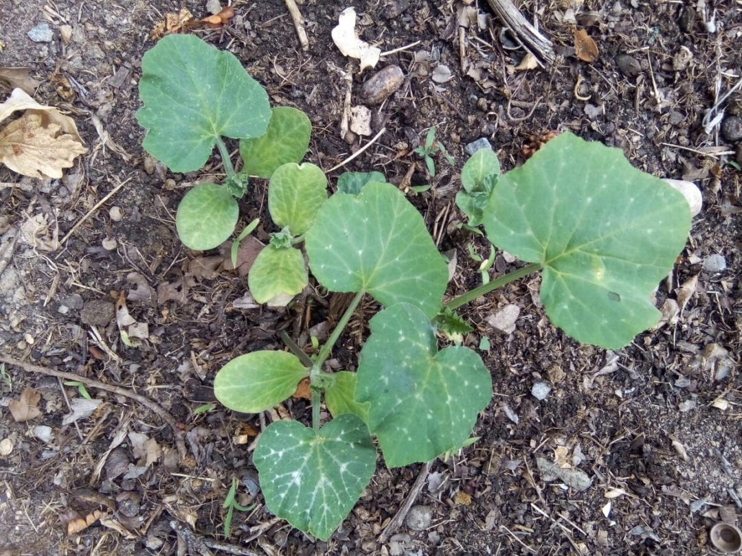 Voilà une quinzaine de jours, des graines de courges-ettes ont germé et poussé dans l'ancien emplacement de mon compost. Je les ai laissé en place et arrosé pour voir ce que cela donnait... Les feuilles sont souples et nervurées de blanc, et recouvertes d'un fin duvet souple ainsi que les tiges. Les feuilles font actuellement le diamètre d'une main d'enfant.