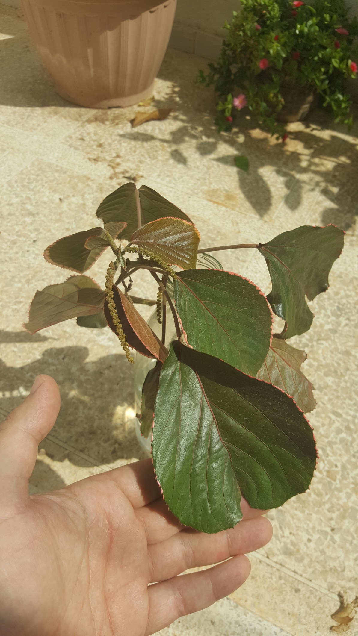 Comme vous voyez, les feuilles sont larges, vert bouteille avec un contour rosé en dent de cie, les ramifications des feuilles sont pourpres.