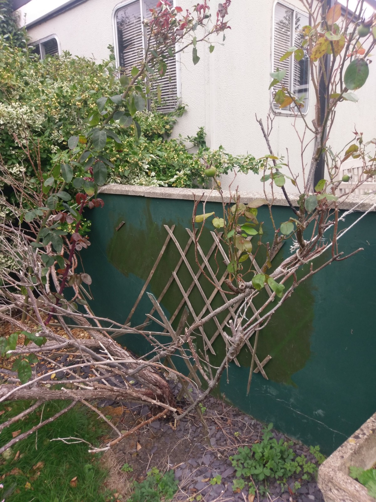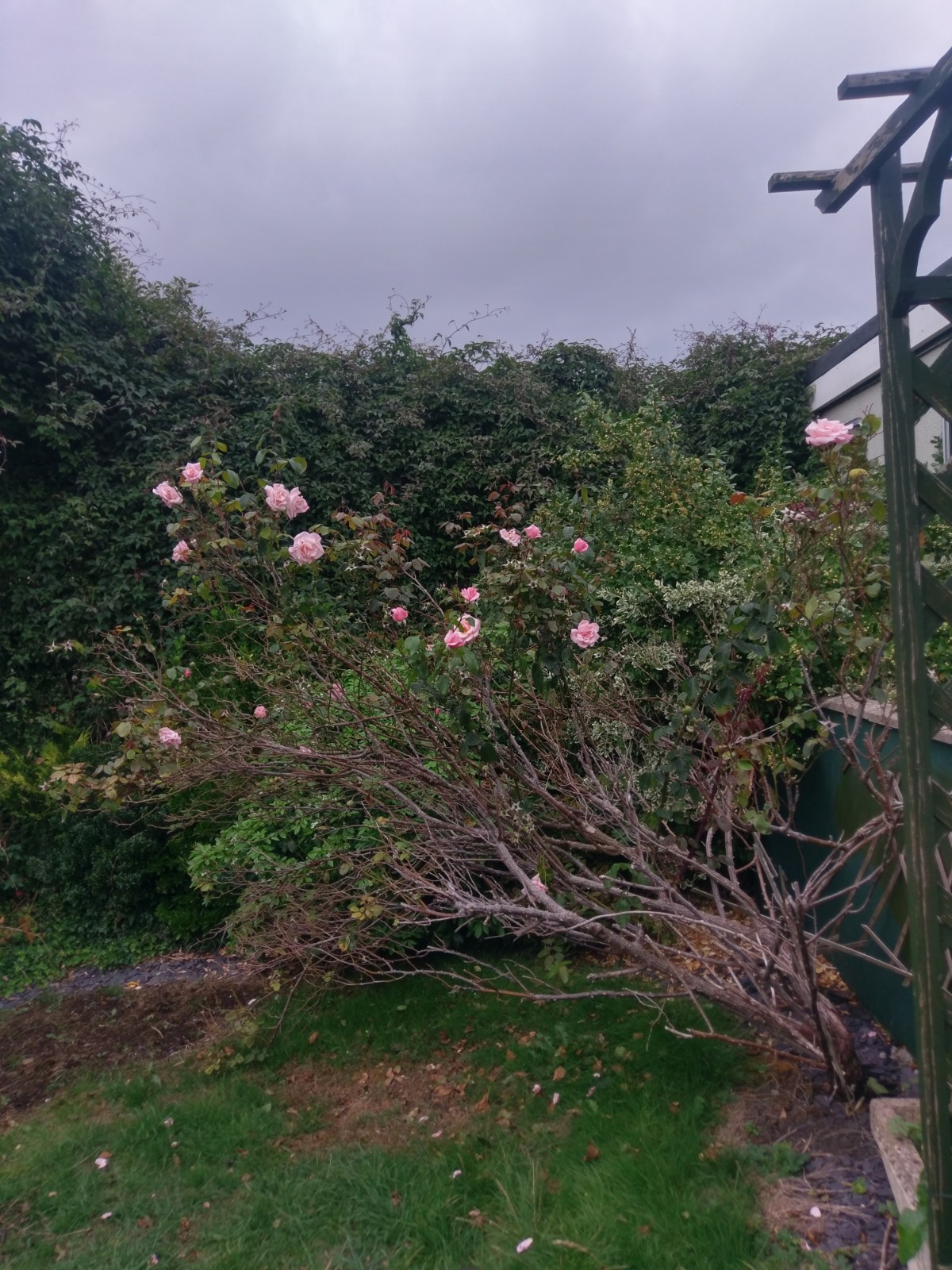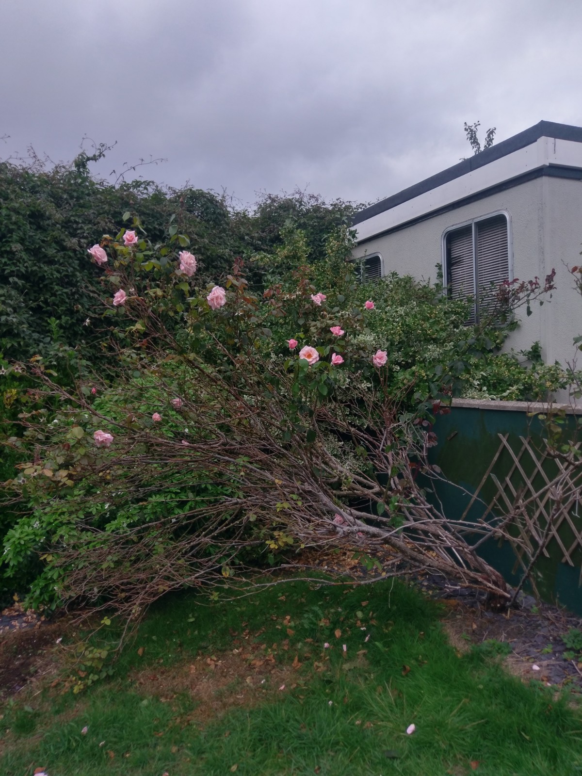 Il y a un superbe rosier, où la moitié des branches paraissent mortes mais de nouvelles pousses apparaissent constamment au bout de ces branches, et il est en fleurs depuis la mi-juin au moins. Il était apparemment attaché à un treillis qui a cédé sous son poids. J'attache des photos à ce post.