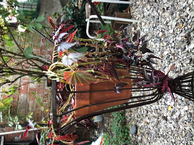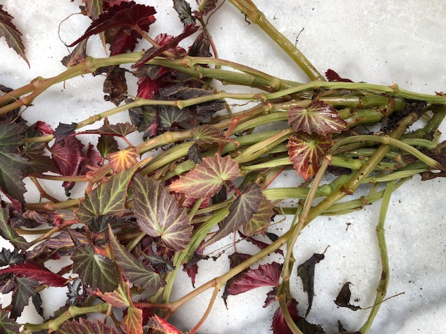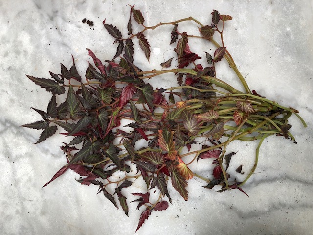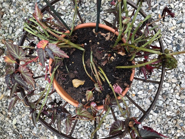 Je viens de m’apercevoir avec consternation que mon magnifique bégonia à feuilles tombantes dentelées pourpres et rouges avait souffert sans que je m’en aperçoive. En attrapant une tige, p’usieurs Me sont restées dans la main, comme détachées des racines, et j’ai fait involontairement un bouquet de me belles tiges.