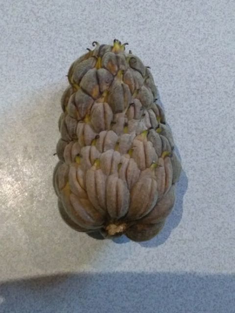 il fait de grandes fleurs blanches puis des fruits dont s'échappent des graines rouges en ce moment