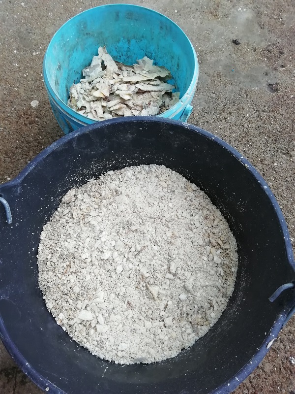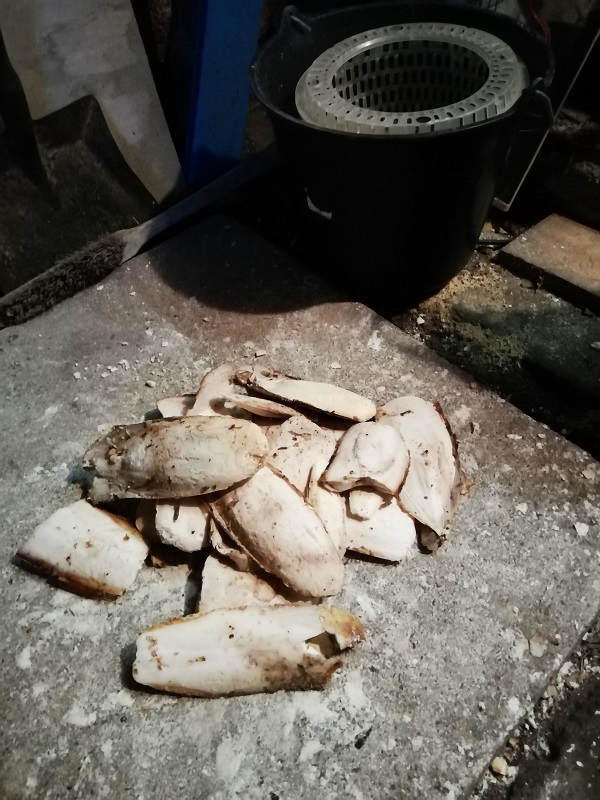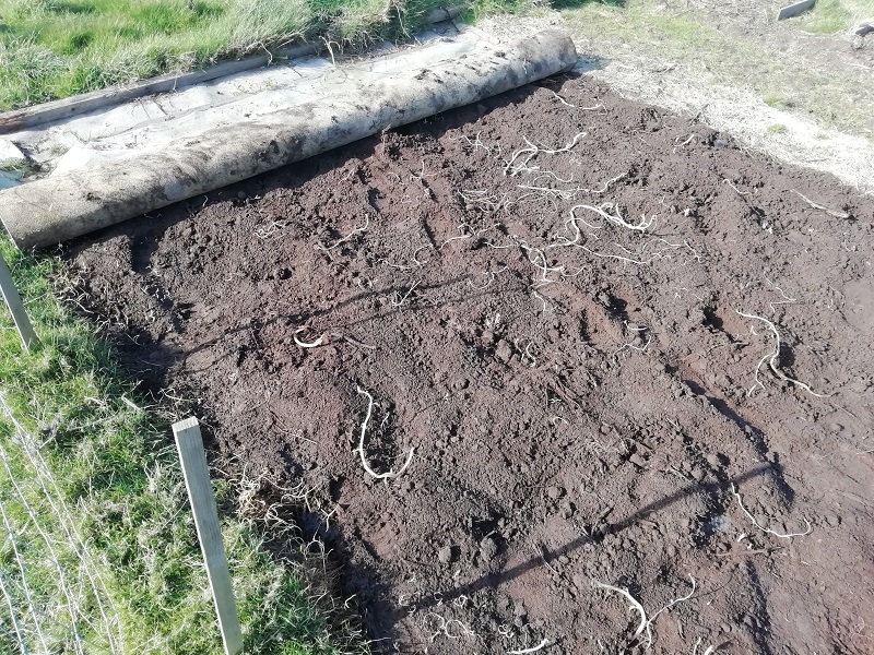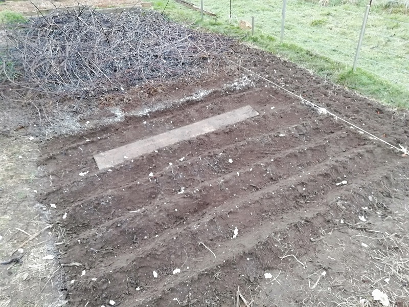 Plantation de 45 vitelottes issues de plants mis en terre l'année précédente. Pourquoi les piquets ? Parce que je compte essayer de faire monter les fanes le plus haut possible, un peu sur le principe de la tour à patates. Donc il y aura des cartons pour retenir la matière organique que j'ajouterai au fur et à mesure de leur croissance (j'ajouterai des piquets horizontaux pour tenir les cartons). Ensuite, j'ai découvert un carré qui était couvert par de la moquette tout l'hiver : en-dessous une terre très meuble (les pousses blanches que l'on voit sont des repousses de patates oubliées lors d ela précédente récolte), un petit coup de grelinette suivi d'un coup de griffe et c'était prêt à planter. Crosnes, ail et échalotes y ont pris place : Les crosnes en poquets par 3 ou 4 : L'ail est planté sur les sillons afin d'éviter les excès d'humidité de notre climat. Au fond, j'ai recouvert les crosnes de fientes d'oie, de fougère broyée comme paillage et enfin de ronces pour que les merles et les lapins n'aillent pas fouiller dedans. Activité d'une matinée de pluie : écraser les os de seiches ramassés lors des promenades de Bidoche au bord de la mer, un gros sac a donné environ 5 litres de poudre, les restes iront aux oies ça leur fera un apport de calcaire. Et ça tombe bien parce qu'elles ont commencé à pondre. Une oie ça ne pond pas beaucoup, mais quand ça pond ça ne fait pas semblant ! 61g pour l'oeuf de poule, 164g pour l'oie !