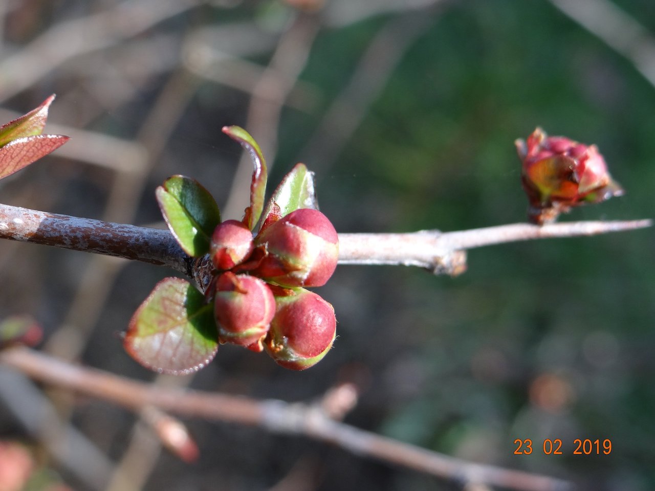 le cognassier du Japon laisse entrevoir la couleur des fleurs