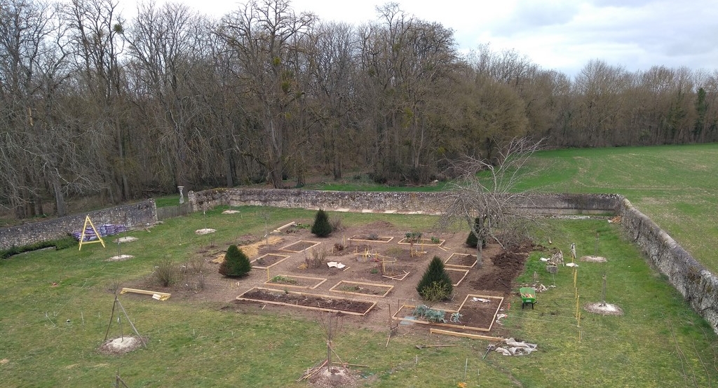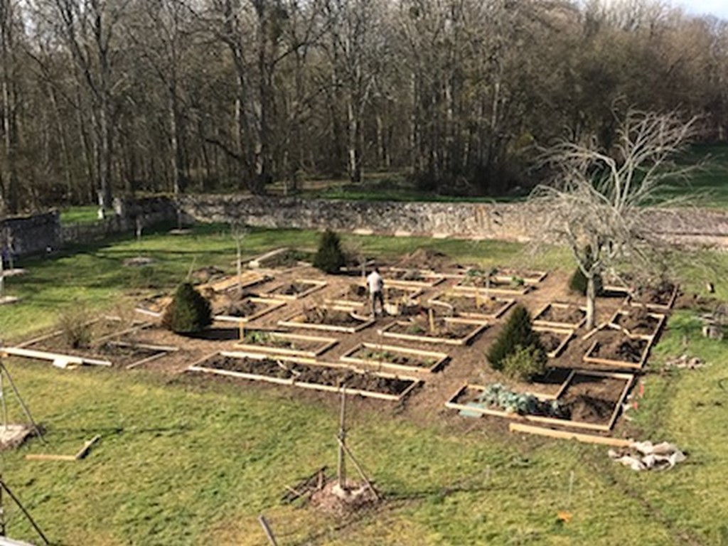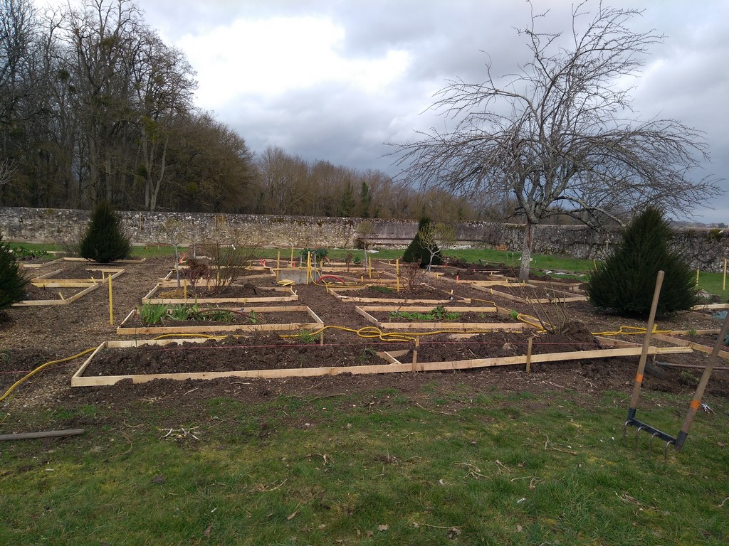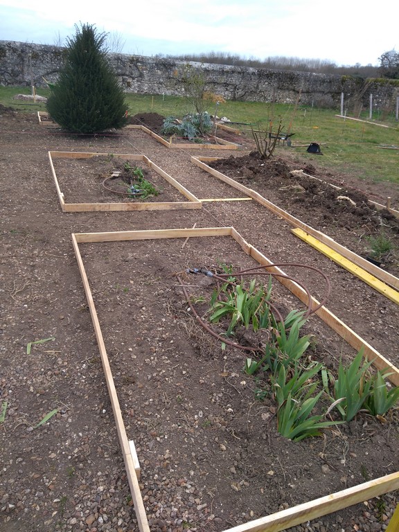 Le jardin carré est divisé en trois "cercles de plantations" et en 24 parcelles toutes munies d'arrosage goutte à goutte. Toutes les parcelles auront du paillage naturel et des mini haies de lonicera. Approche bio-dinamique et naturel.