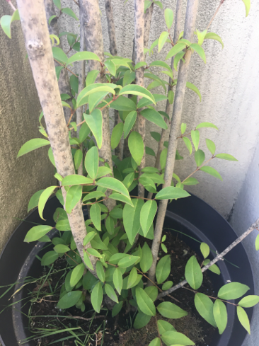 Une plante en pot agonisante abandonnée dans la rue en Ile de France... Je vois... Je vois un Ficus. Eventuellement un Laurier.