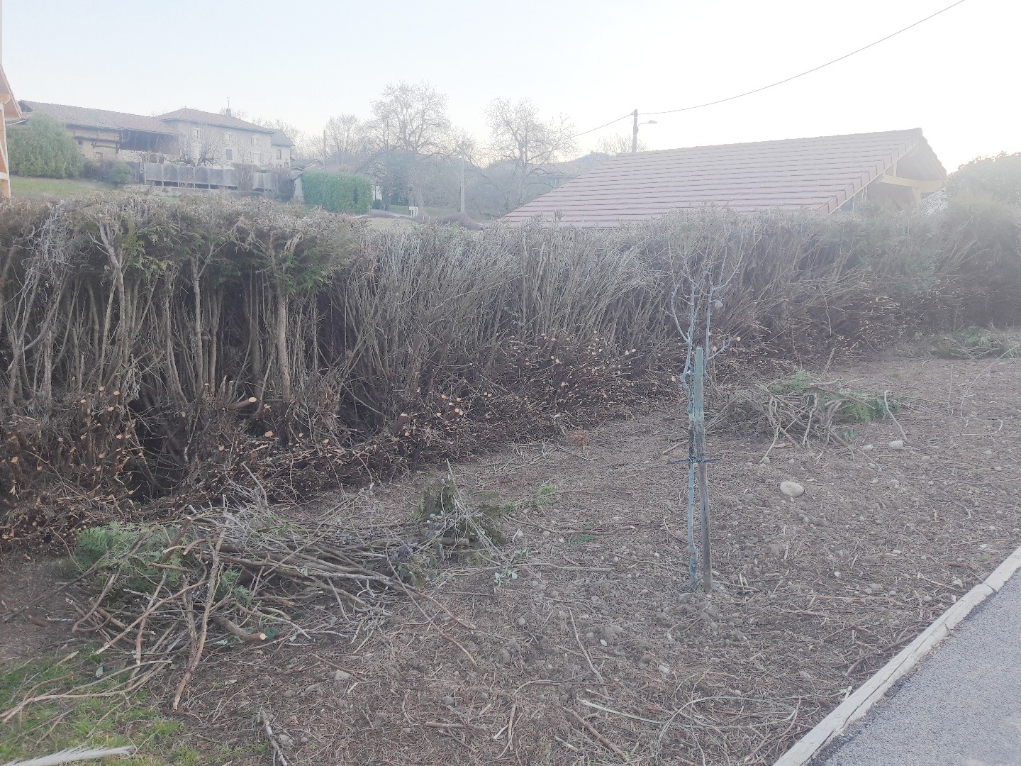 Moche pour moche, j'ai décidé de la réduire de moitié. Je ne peux pas complètement l'enlever car de nouveaux voisins font construire de l'autre côté et elle doit donc nous permettre de rester un peu à l'abri des regards. Je me suis dis que réduire fortement la largeur libérerait la place pour planter une haie parallèle d'arbustes variés. Et d'utiliser le reste de haie comme tuteur pour des arbustes à kiwis.