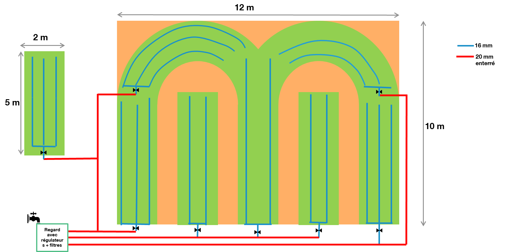 Je met en pièce jointe le plan du potager avec le projet d'irrigation, mes interrogation portent sont les suivantes: