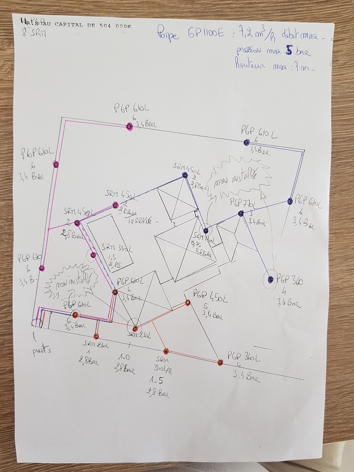 2°/ Les réseaux sont très très chargés, sans doute à la limite de la limite de limite de la pompe. Le réseau rose fait PLUS DE 3000 l/h ! le réseau bleu marine tel que dessiné sur l'étude fait 2900 l/h alors qu'il est très long !