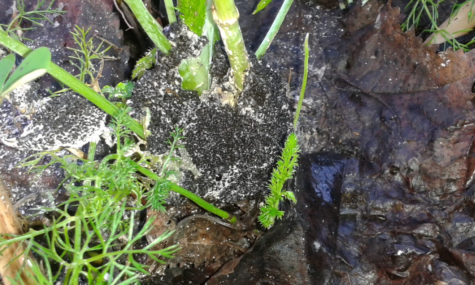 Ça ressemble a une ponte d'où sont sortis de minuscules choses noires ressemblant aux pucerons. Désolée pour la qualité de l'image prise avec un smartphone... Alors, une idée ? Merci a vous!