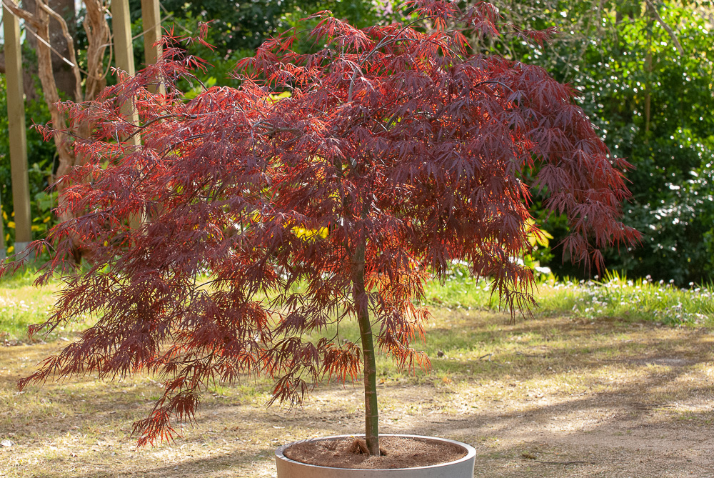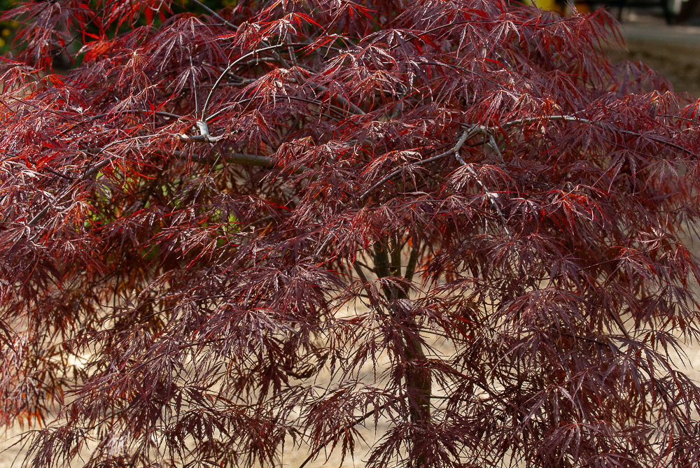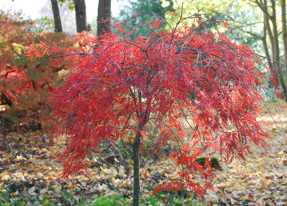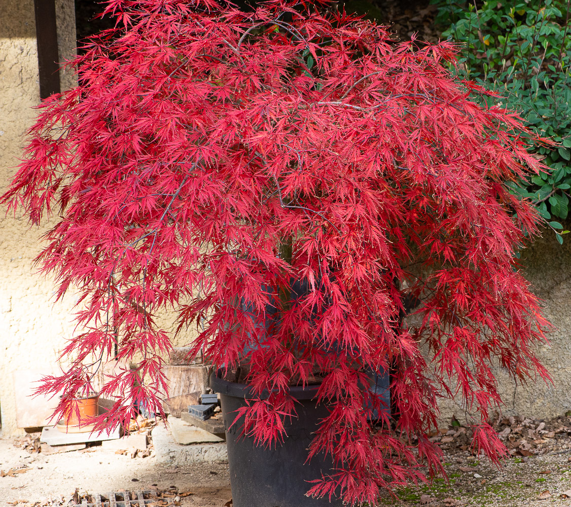 Acer dissectum ‘Tamuke yama’ fin octobre. Le rouge vif plutôt vermillon est uniformément réparti sans variations carminées comme on en voit sur ‘Garnet’.