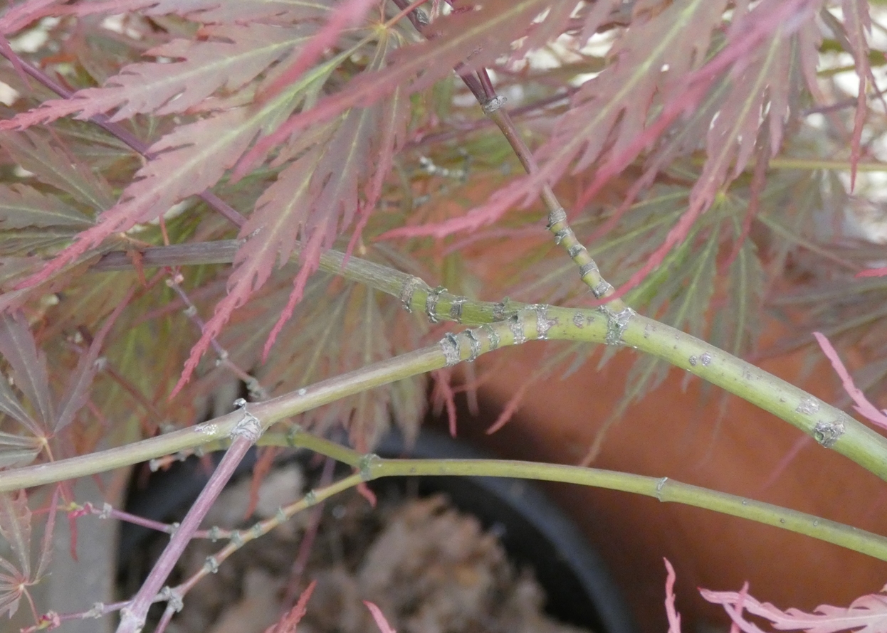 J'en ai un aussi. Il est greffé sur un tige de 1m80 donc assez haut. Je confirme qu'il forme des tiges avec des nœuds assez espacés. Après je trouve qu'il est assez facile. Après sur les feuilles, c'est comme entre Bloodgood, Fireglow et atropurpurem, il est franchement proche de Inaba shidare et Paul garnet. Le port est juste un peu différent. Les trois poussent fort.