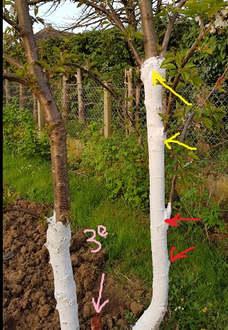 Pour le morceau de droite, ma fille et moi nous avions essayé chacune 2 greffes à oeil dormant vers le 15 aout, elle les 2 du bas (fleches en rouge) et moi les deux du haut (fleches en jaune) si tu regardes bien au milieu y a un moignon c est le 3eme tronc, qui crève...