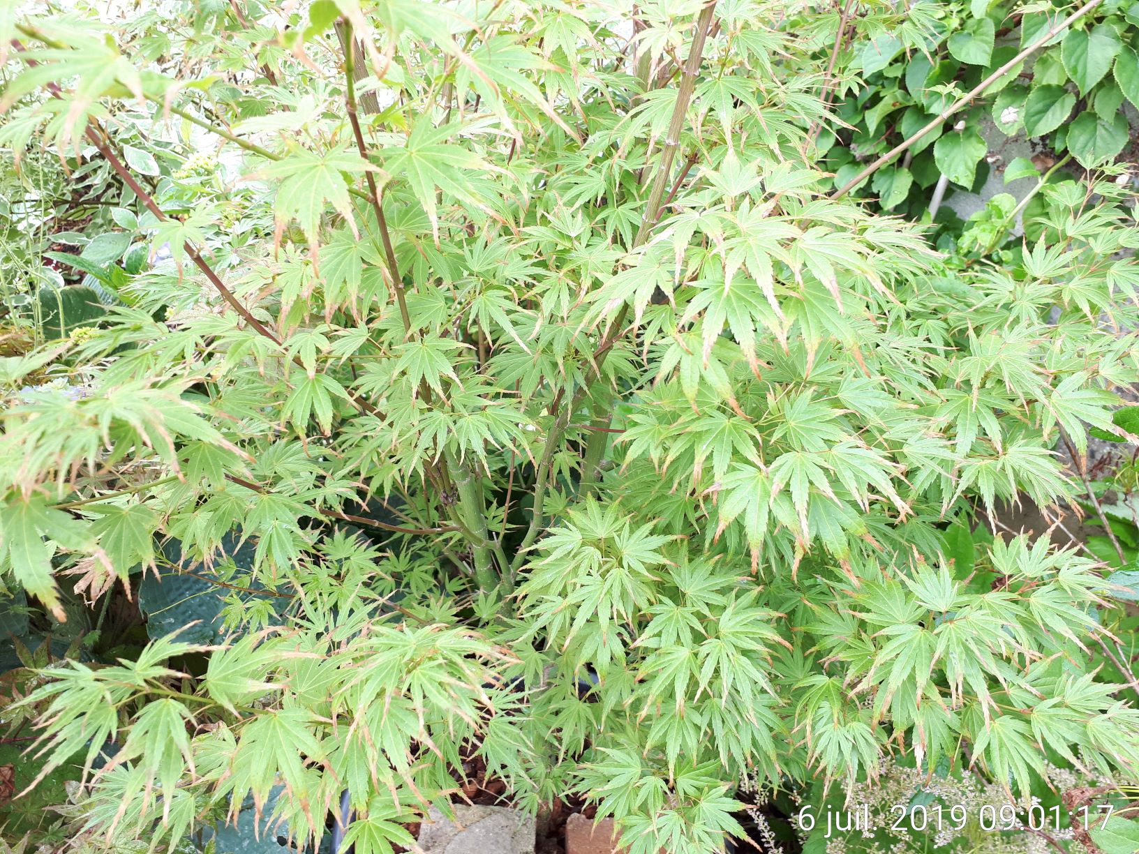 Oui, et puis surtout il est resté en serre, sans voir le soleil direct, un peu trop longtemps : mon jardin actuel est maintenant trop petit pour accueillir l'hiver tous mes Erables du Japon (plus de 40), et j'utilise la grande serre vide d'un voisin sympa pour protéger certains sujets, dont les plus fragiles et les plus petits. Je n'ai rapatrié celui-ci que tout récemment, un peu tard donc pour qu'il affiche tout son potentiel au jardin… Il me reste encore quelques sujets et pas parmi les moins lourds à transporter…