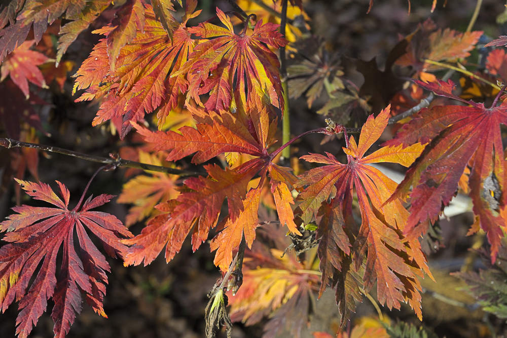 Un Erable aux feuilles très originales, très grandes et très découpées, chaque lobe étant lui-même profondément divisé. La couleur à l'automne est incroyable, avec des nuances de rouge-orange étonnants !