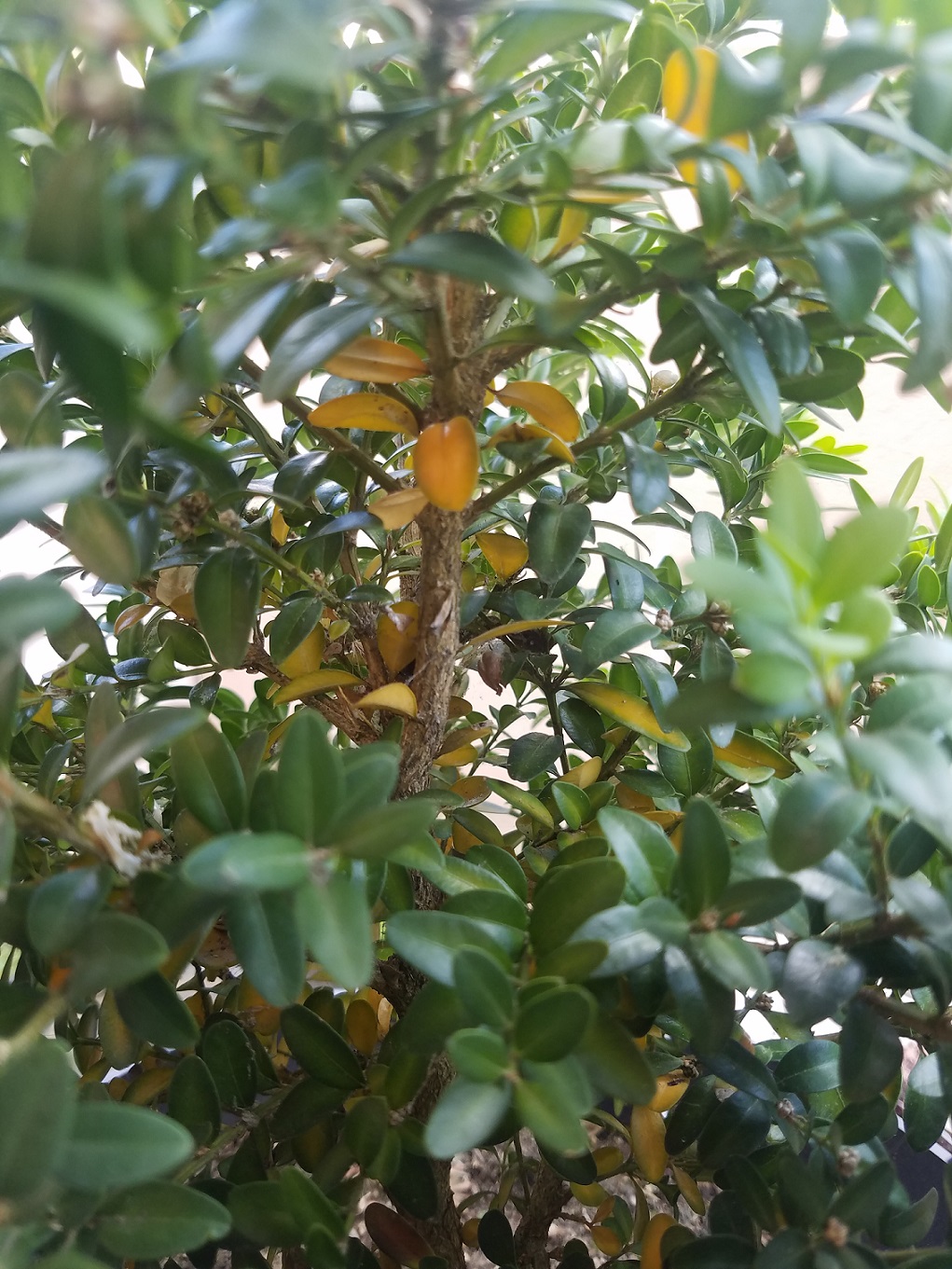 Depuis plusieurs jours certaines feuilles sont devenues jaunes / orange, principalement à l'intérieur de l'arbuste.