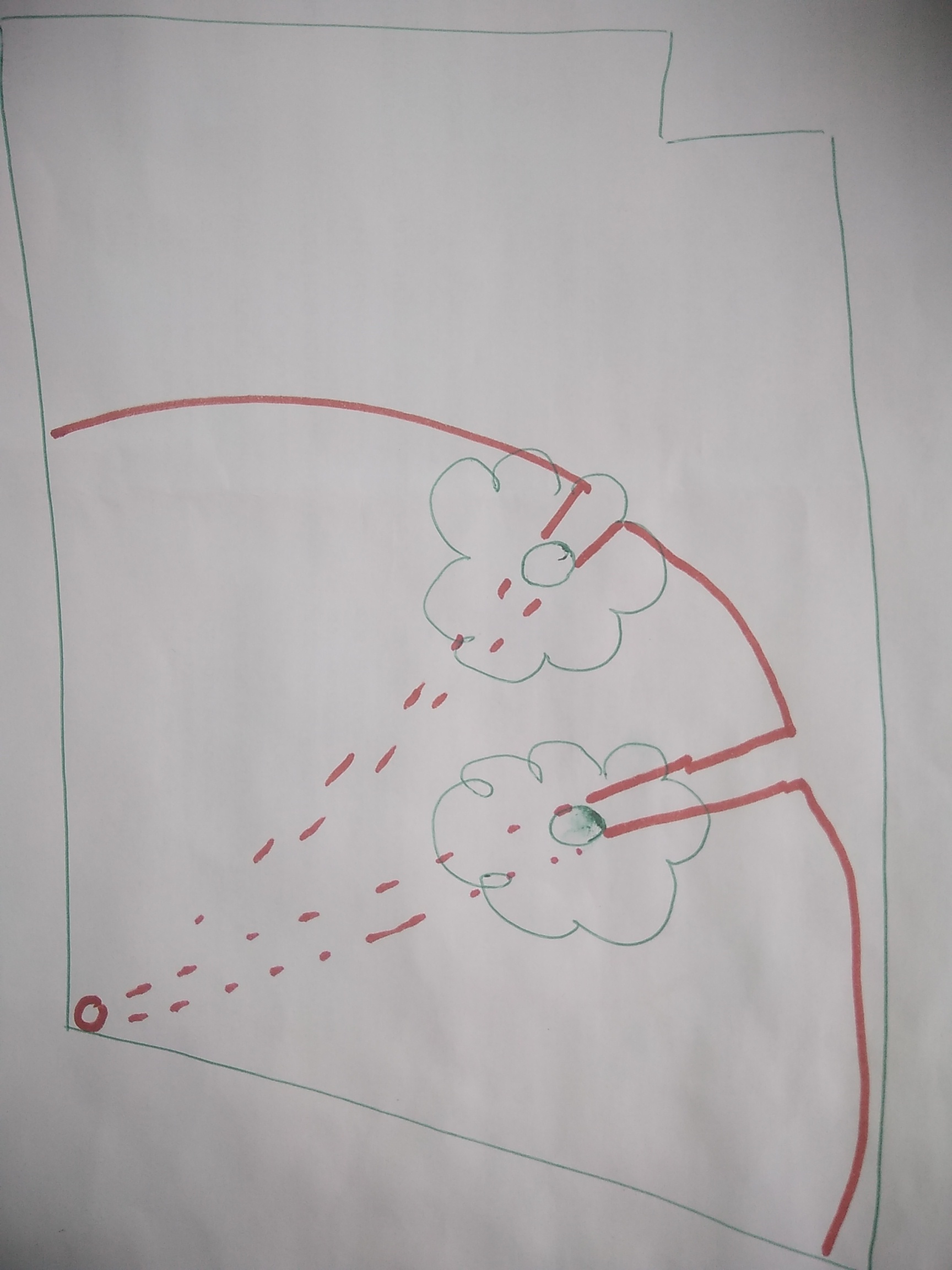 Je vous joint une photo d'un plan de mon jardin fait en vitesse. En rouge nous avons l'action et la portée de larroseur, j'ai deux arbres qui me gène dans l'arrosage.