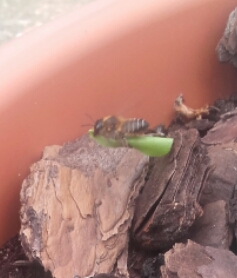 De drôles d abeilles je dirais de taille standard mais de couleur plutôt noire sont apparues. Je suis plutôt content vu que leur population est en déclin. Leur particularité est qu'elles se baladent avec des petites feuilles qu' elles découpent et roulent en tube avant de s enfouir avec sous le paillage dans mes pots de fleurs. Du coup j ose plus déplacer mes pots. Cela les perturberait? Pour le moment ça me distrait de les voir faire mais y a t il un risque que je me retrouve avec des essaims sur ma petite terrasse?