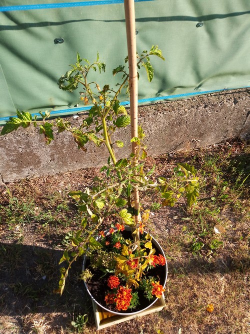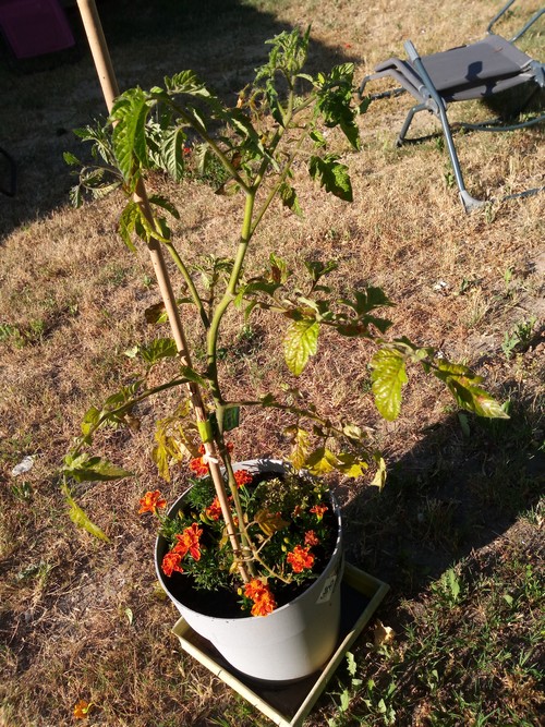 Tout à fait d'accord avec Bugade, ce pied de tomates lutte pour la vie dans un pot étriqué. Il lui faudrait un pot 3 fois plus grand, mais il doit rêver secrètement de la pleine terre !