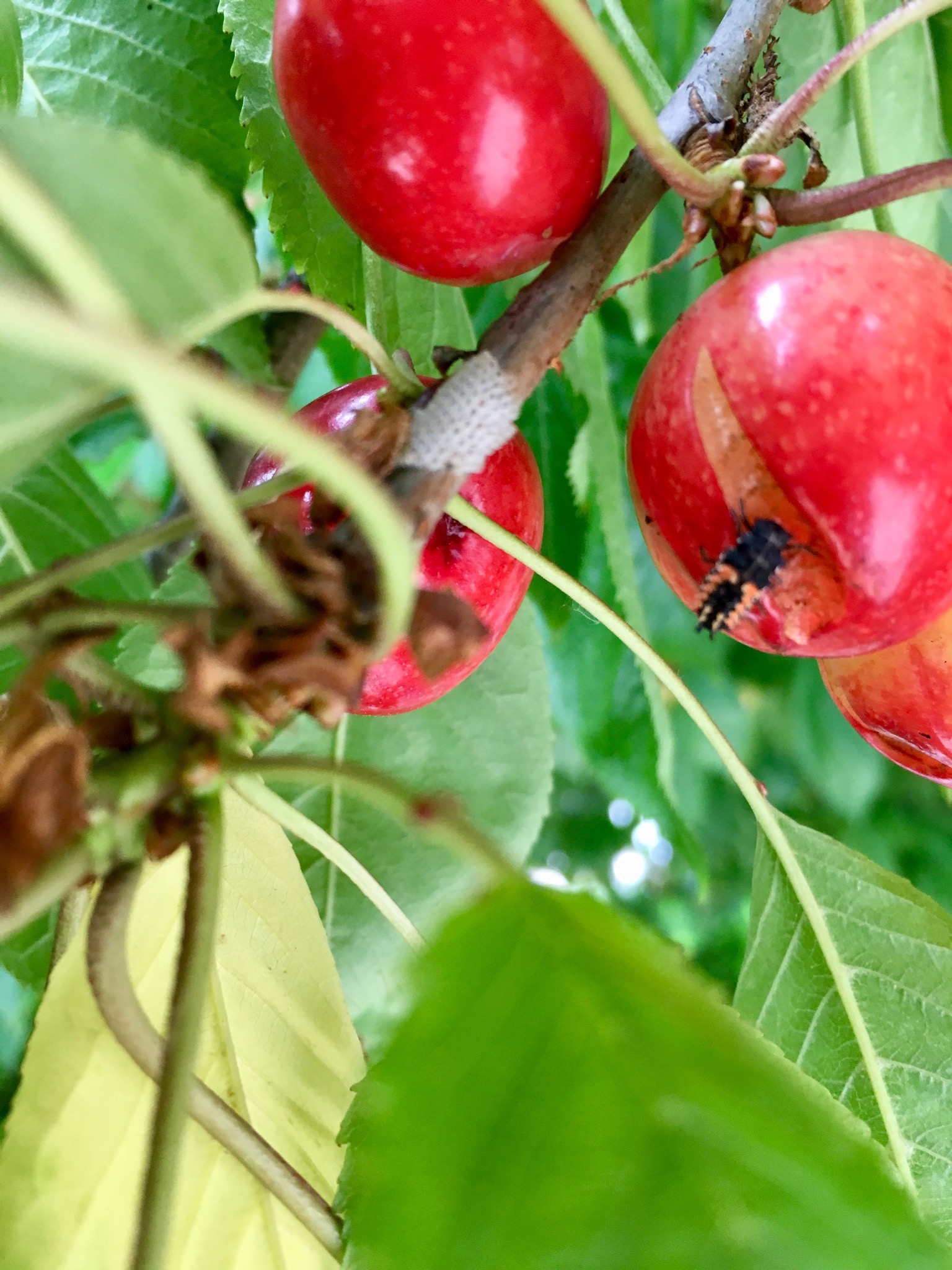 Bonsoir. Ce sont bien des larves de coccinelles asiatiques. Cela dit, il ne faut pas si méprendre. Ce ne sont pas ces insectes qui abîment les cerises. Vu la forme, il s'agit surtout de craquelure sur le fruit, c'est assez courant. Je pense que c'est lors de la formation du fruit, l'arbre à manquer d'eau (supposition).