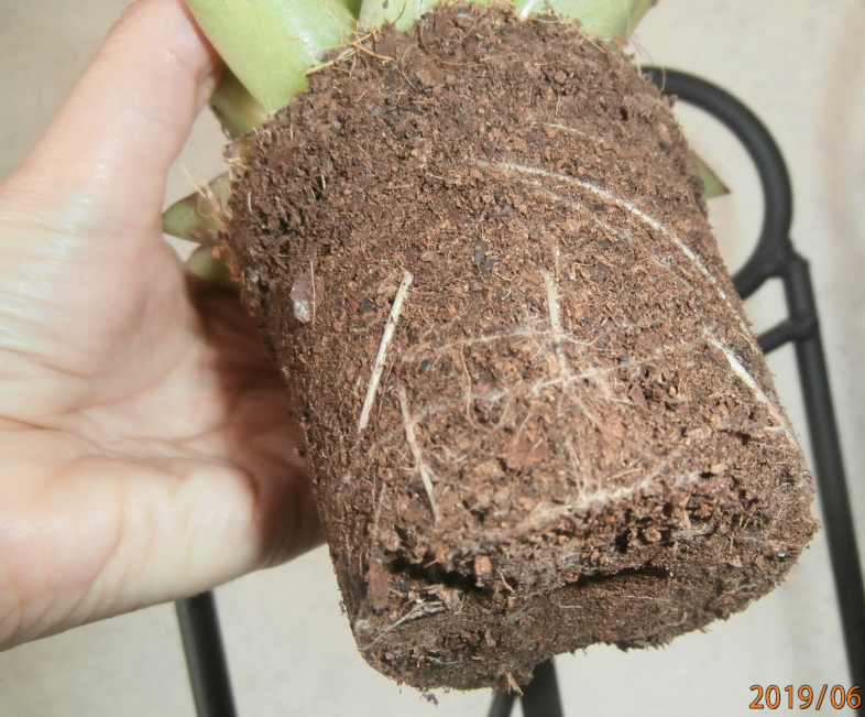 Voici sa motte, elle ne semble pas encore trop à l'étroit mais peut être qu'il serait préférable de changer son substrat et donc la rempoter de suite ?