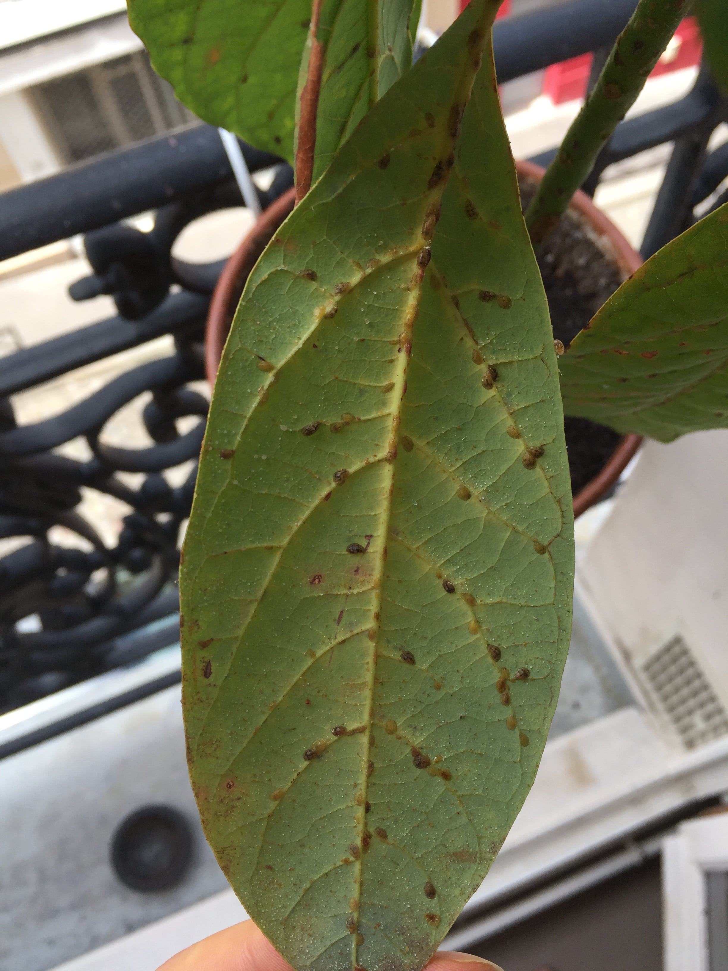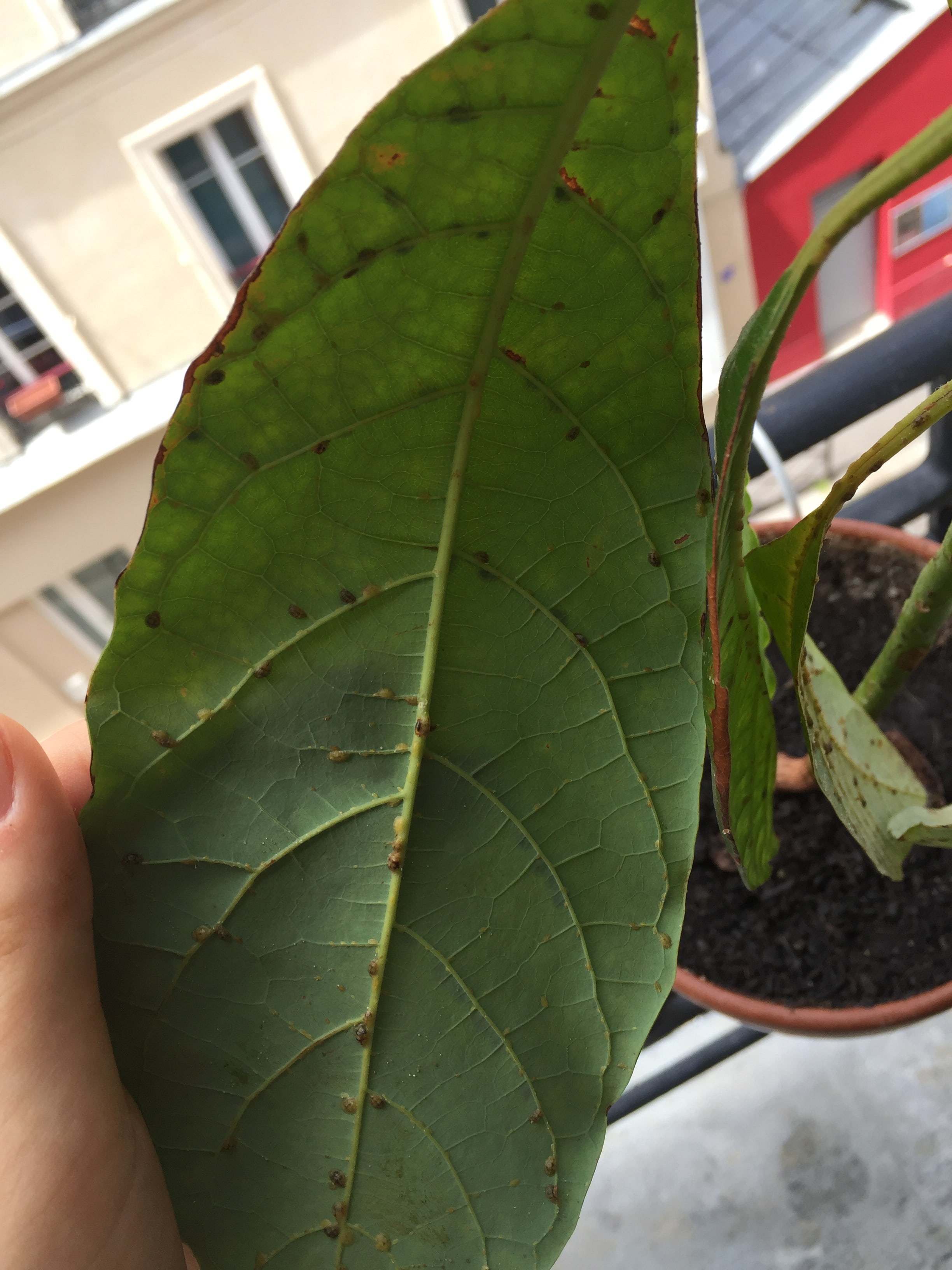 J'ai planté il y a deux ans un avocatier, qui se portait très bien jusqu'à il y a deux mois. Peu à peu, ce qui me semble être un parasite s'est développé sur les feuilles du bas puis le long de la tige. Il s'agit de sortes de "boutons" jaune foncé et marrons, que l'on peut retirer facilement mais qui réapparaissent en quelques jours e se multiplient de plus en plus rapidement.
