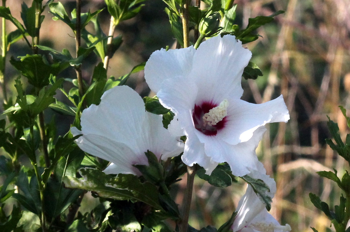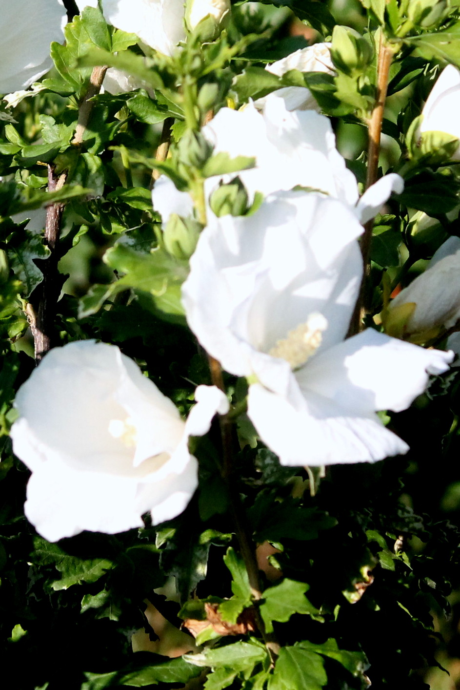 Quelques roses fraiches malgré la chaleur et un Hibiscus syriacus tout blanc, qui refuse de se reproduir de semis.