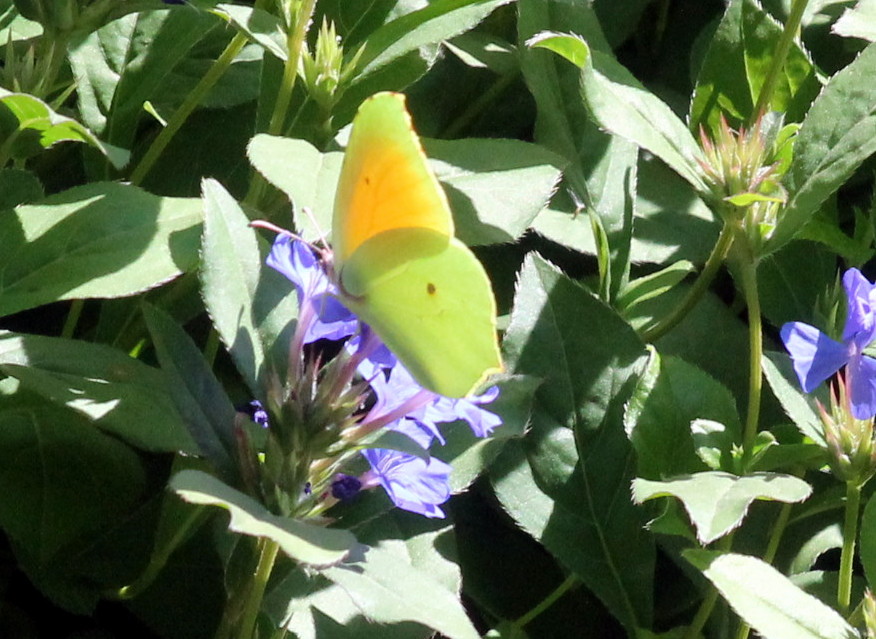 et un petit papillon jaune prend la pause sur le bleu des Cératostygma.