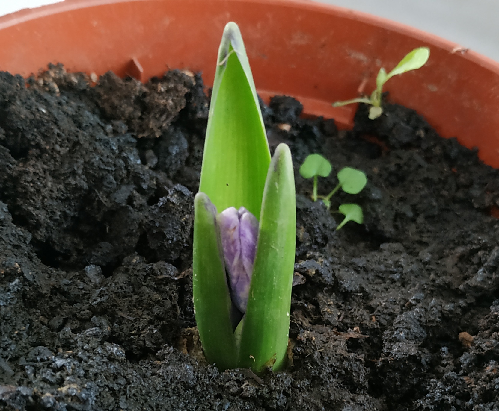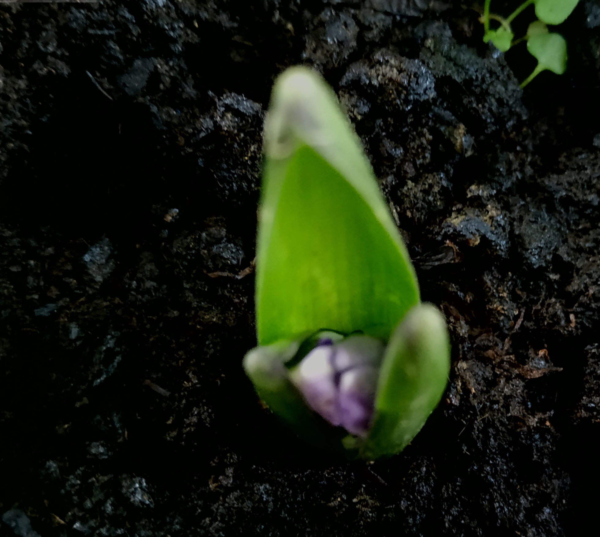 Depuis quelques jours les feuilles ont fané, j'ai tout enlevé et là on a découvert une fleur qui repousse, couleur violette. Mais j'ai aucune idée de ce que c'est.