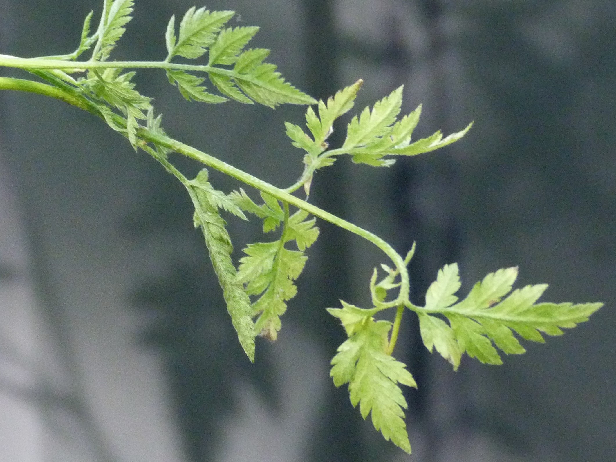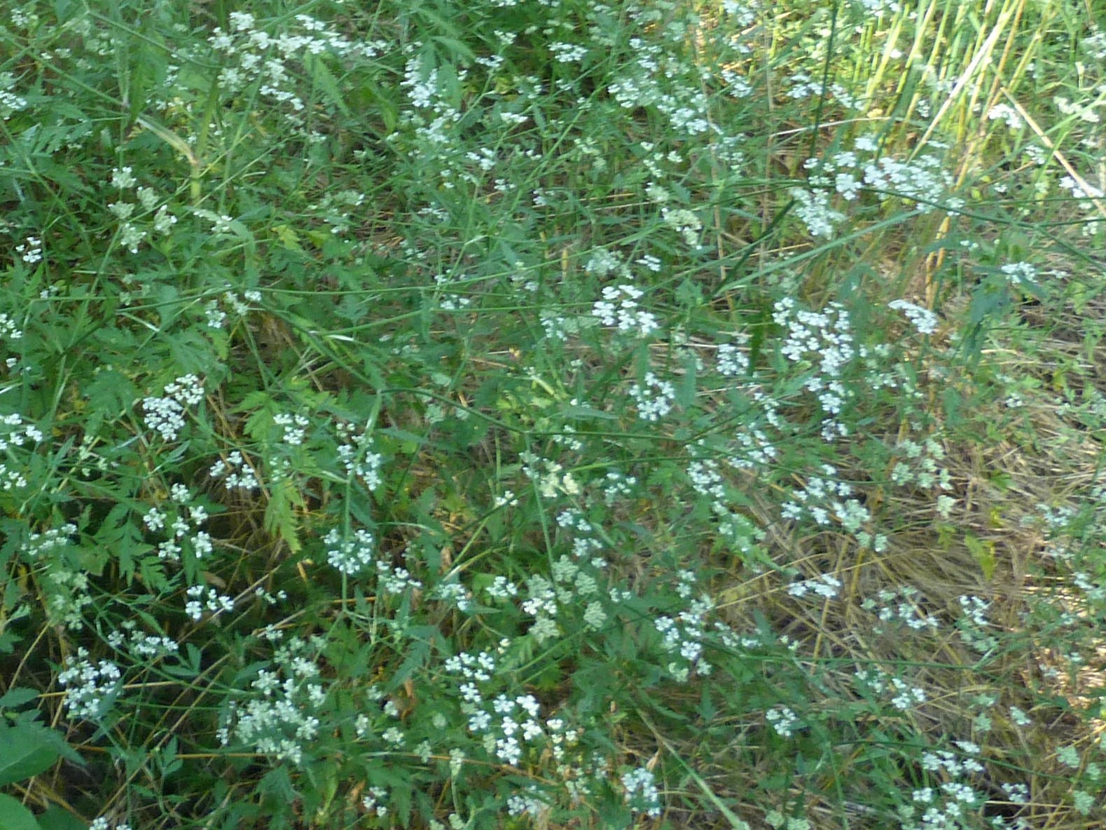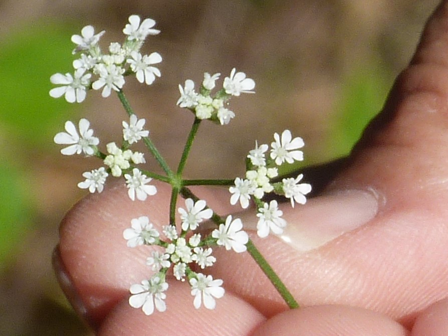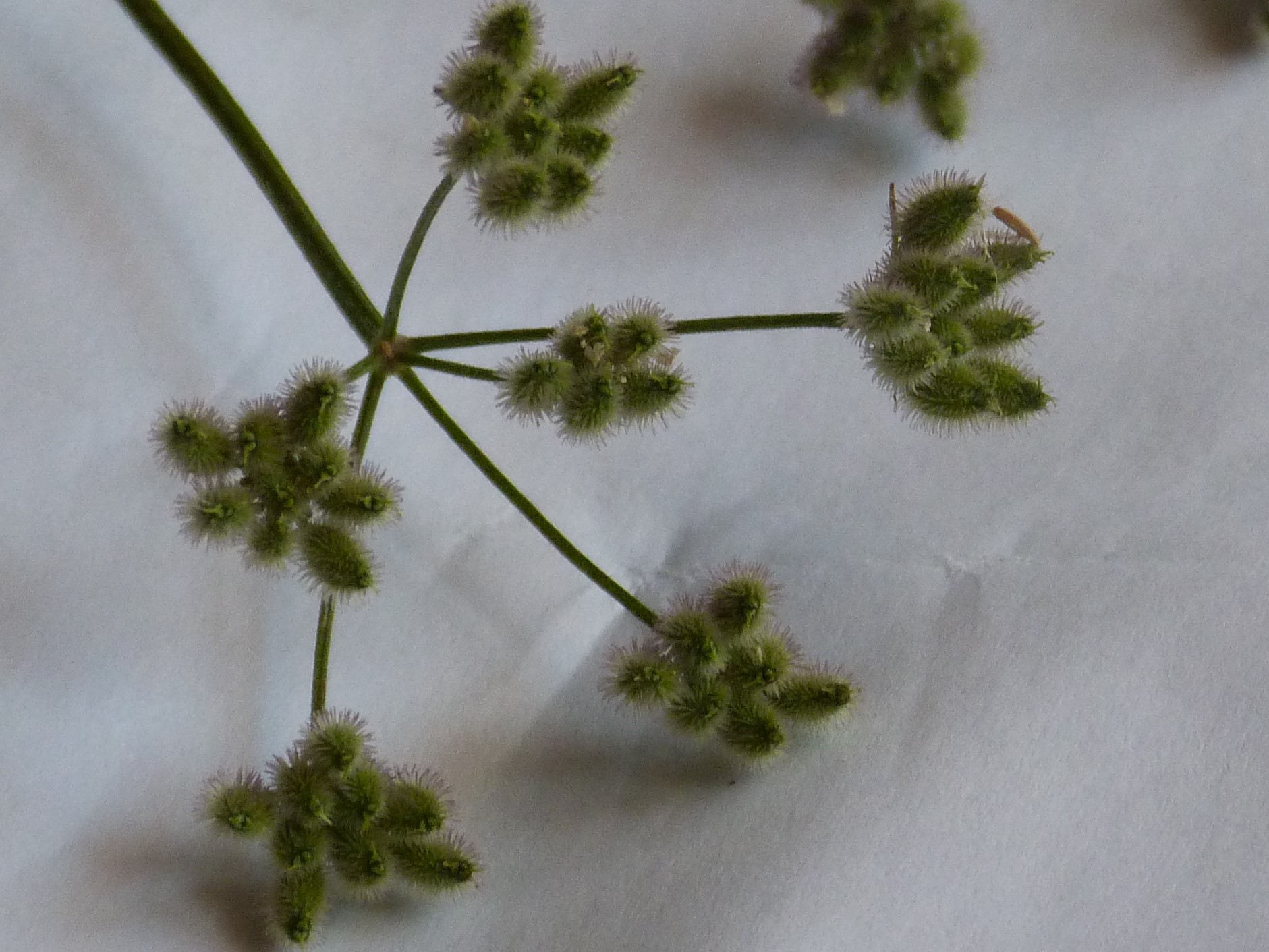Les feuilles ressemble a la carotte sauvage ou la ciguë, la tige n'est pas poilu, aucun "crochet" sous les fleurs. Les graines elles, sont couvertes de crochets qui s'accrochent partout. La tige, lisse, a des "anneaux" façon bamboo, violacé par endroit.