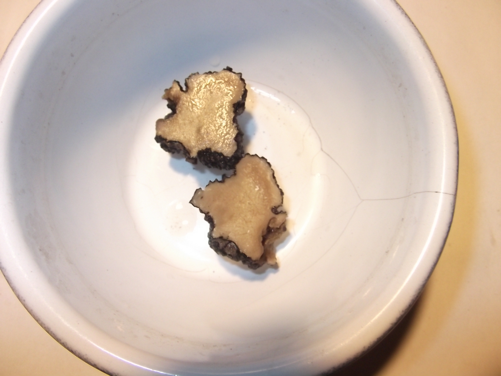 Mais dans ta région c'est certainement la truffe locale "Tuber uncinatum" pas encore colorée et immature car ce n'est pas la saison, quand elle est mûre on parle d' un arôme de noisette.