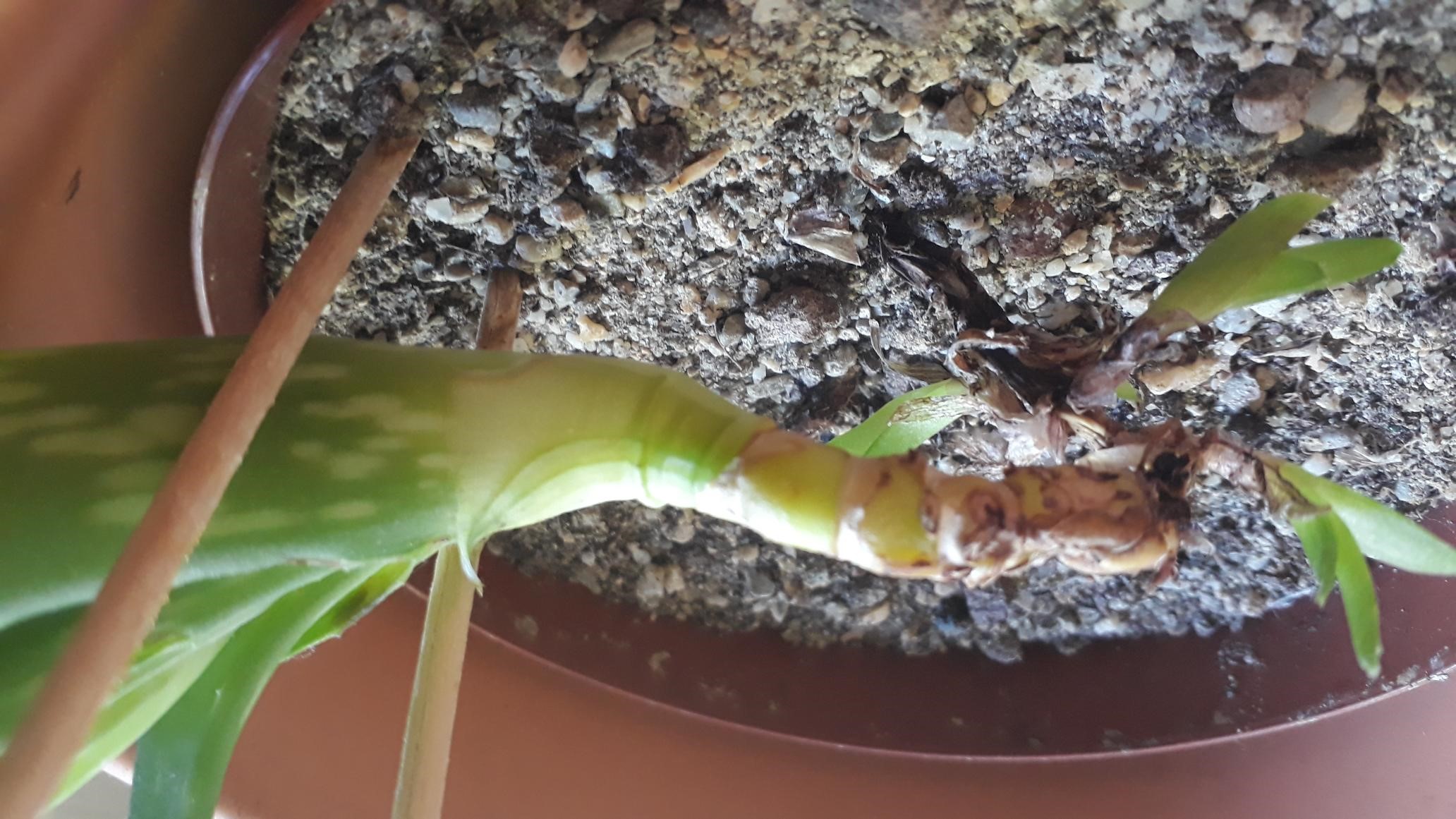 Coupe le pied à la base de la partie jaune sur la photo, laisse sécher quelques jours et quand ce sera bien sec tu remets dans le pot sans arroser. De nouvelles racines devraient pousser relativement rapidement, et alors tu pourras arroser de nouveau.