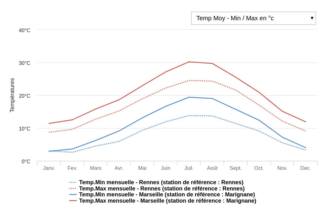 Et voilà ce qu'il donne quand on compare les climats de Marseille et Rennes pour les minimales et les maximales
