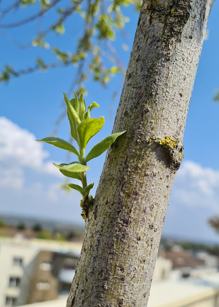 la nouvelle branche de saule vert apparue malgré le "piercing" de la cicatrice d'une branche élaguée est issue d'un bourgeon latent , signe de la vigueur du porte greffe